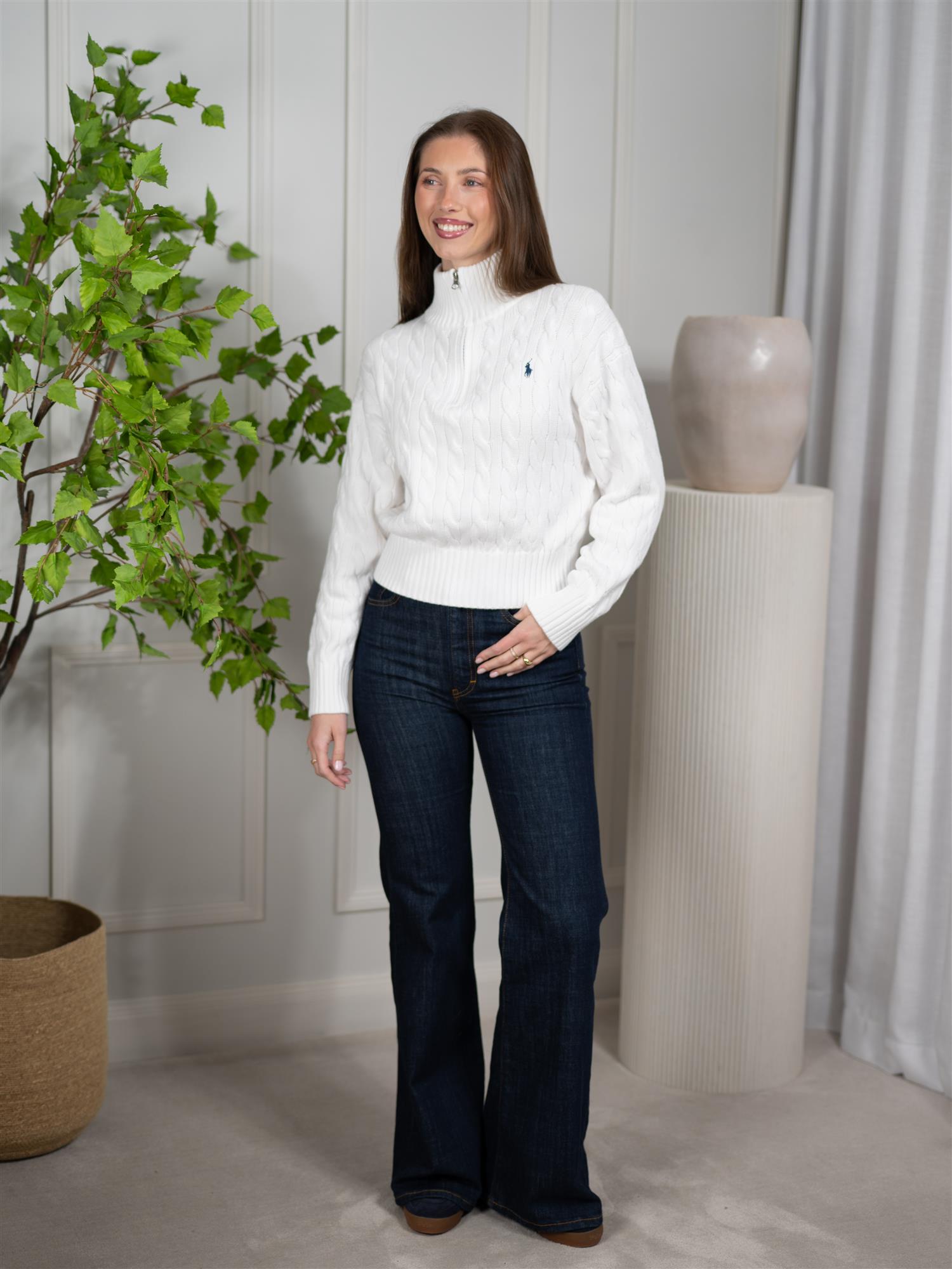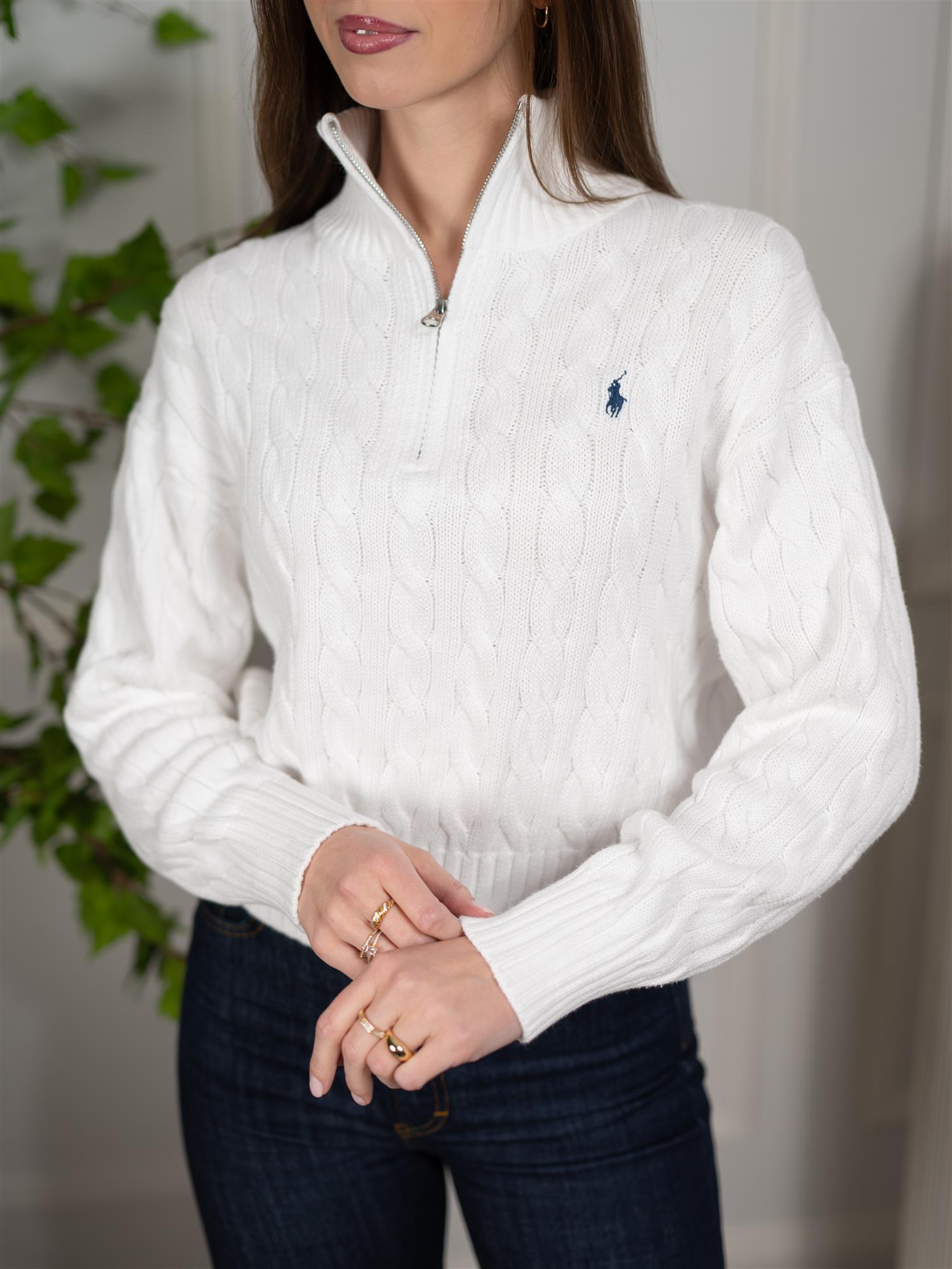 Denne langermede genseren fra Polo er laget av 100% bomull, noe som gir en myk og behagelig følelse mot huden. Den hvite fargen gir et klassisk og tidløst utseende, perfekt for både avslappede og mer stilige anledninger. Designet med kabelstrikk, half-zip og blå hest-brodering i kjent Polo stil.