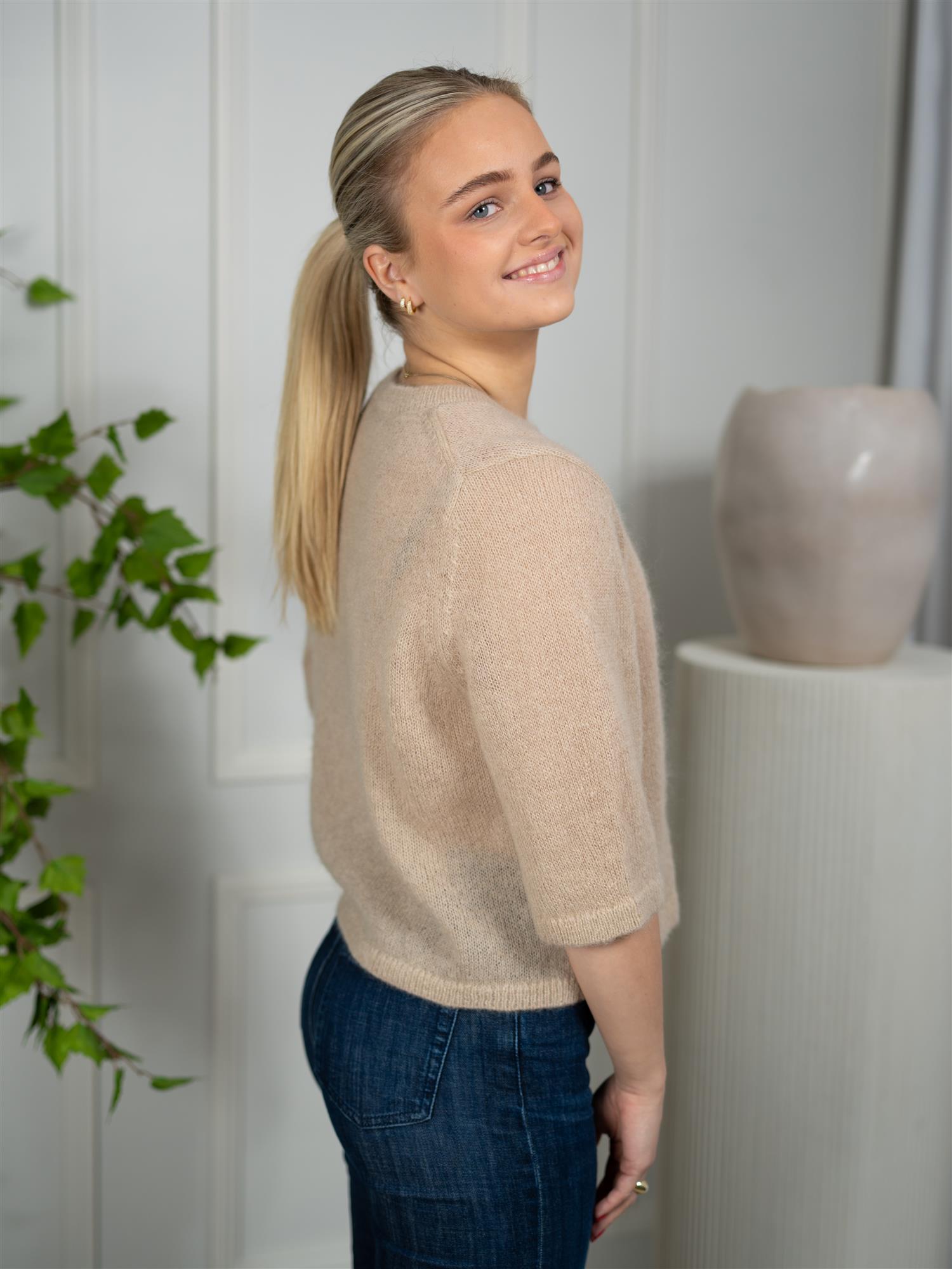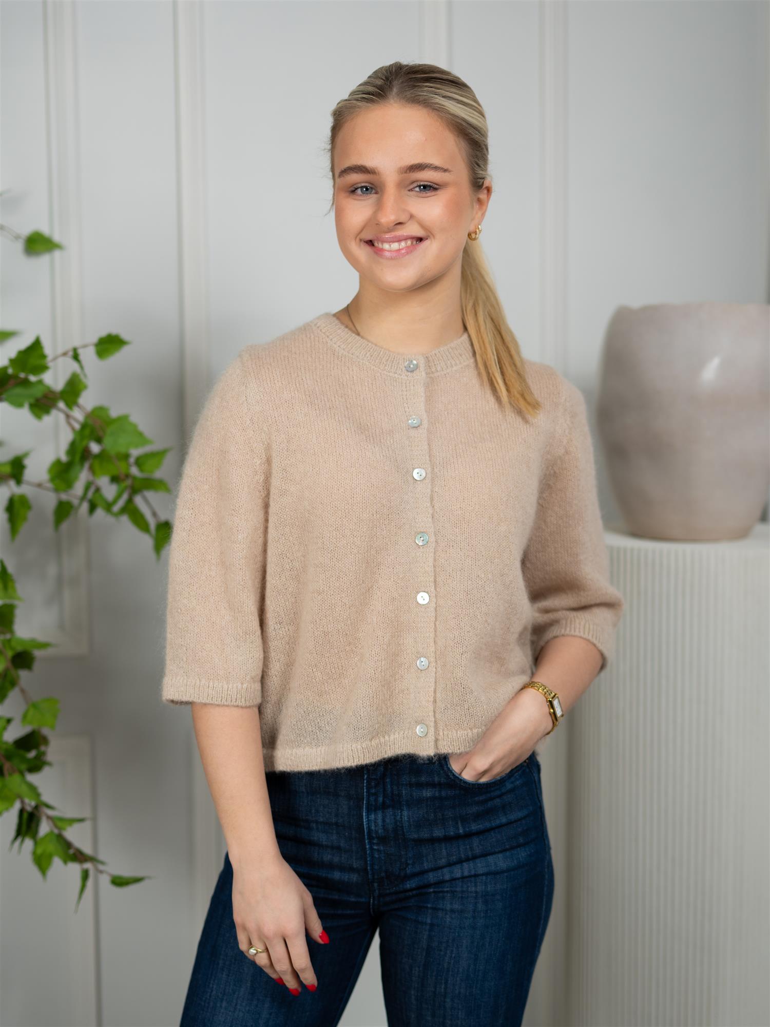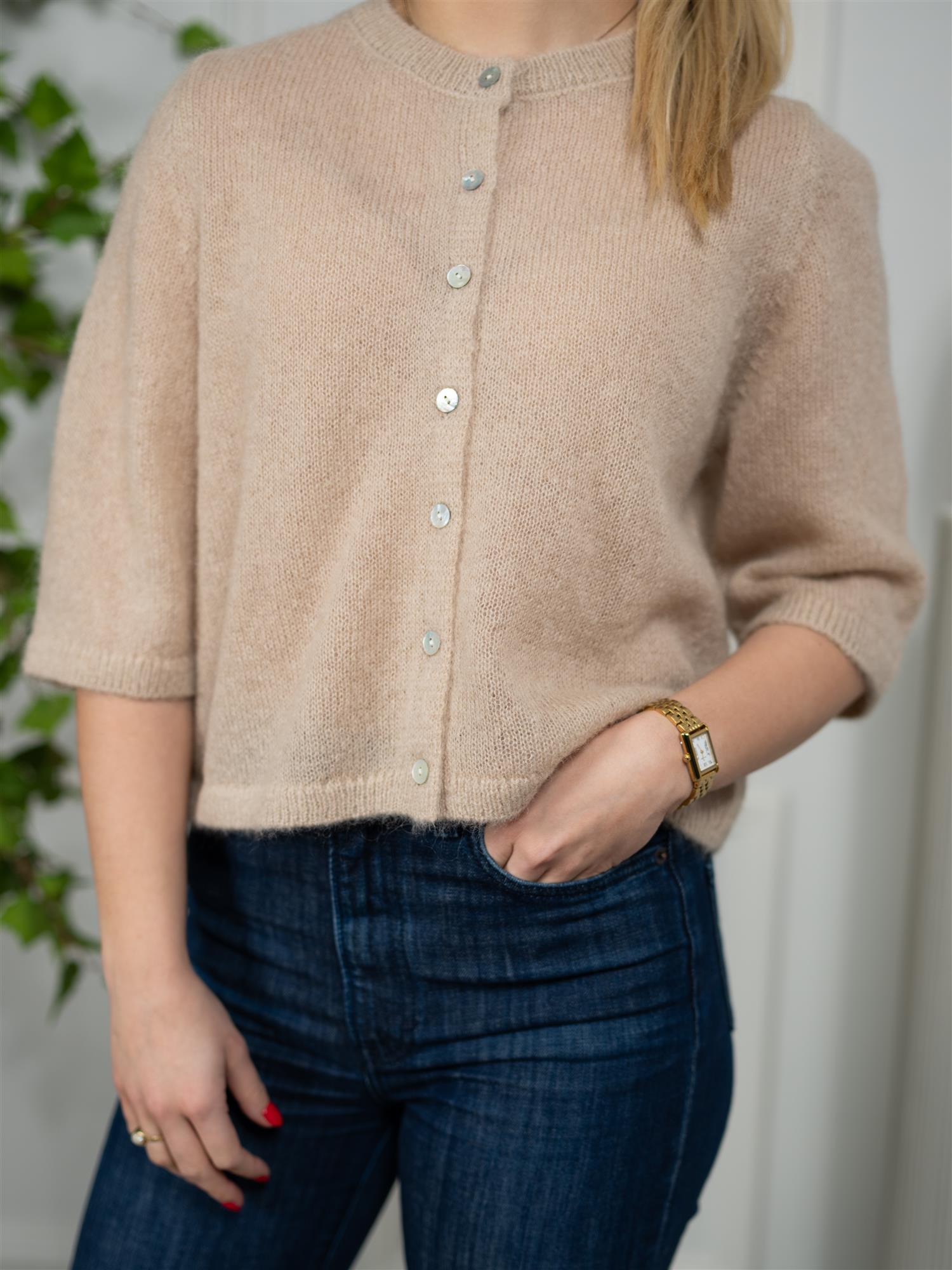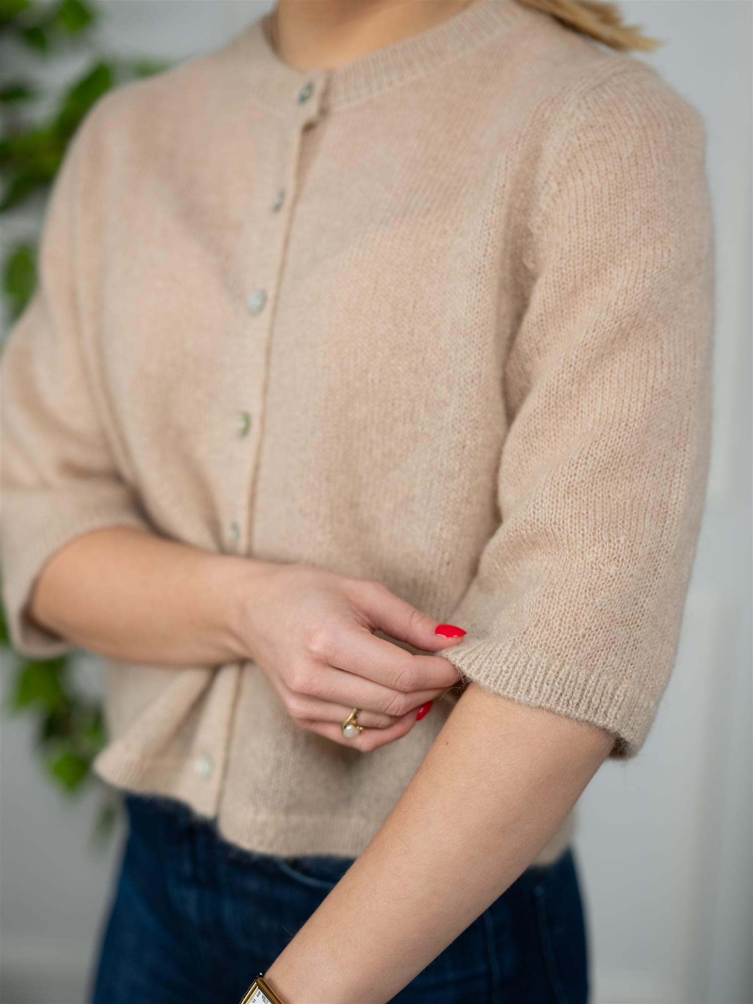 Cardigan fra Dear Dharma med halv erm og kort lengde i lekker beige farge. Designet med rund hals og knappestople i front. En løs og romslig cardigan som er like fin over en enkel singlet som alene.