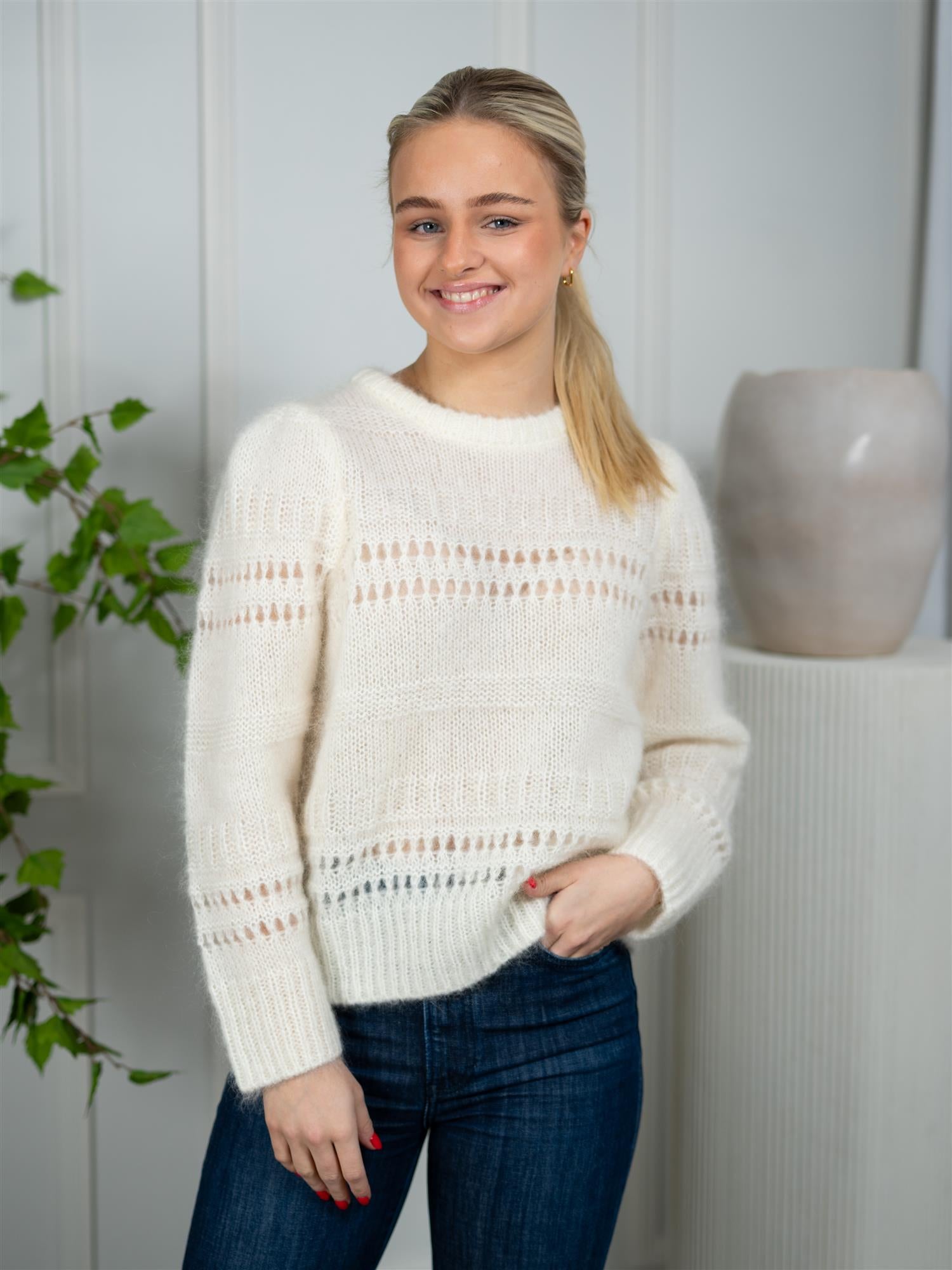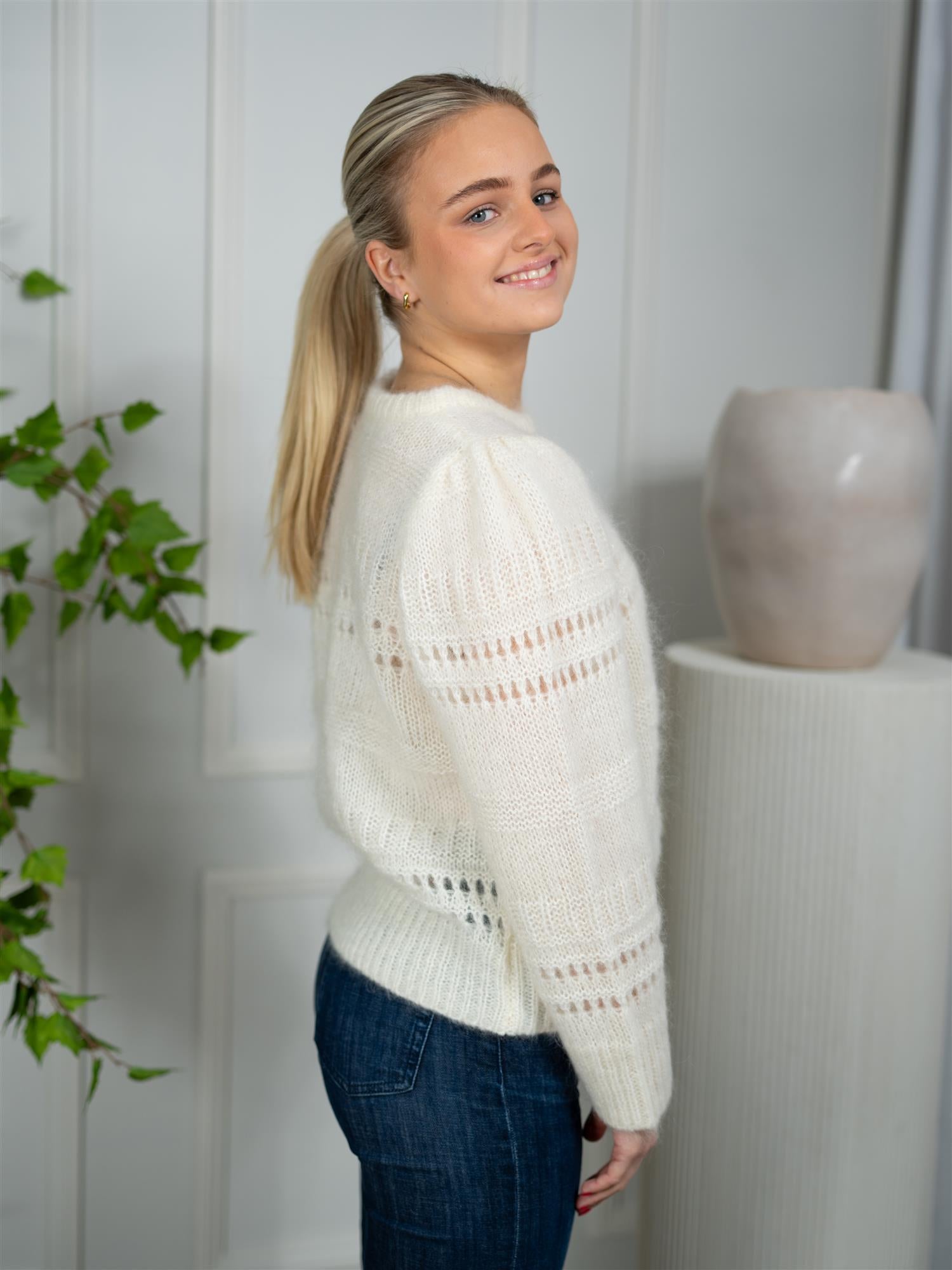 Kremfarget strikkegenser fra Dear Dharma. Designet med rund hals, liten puff i skuldrene, ribbestrikket bunn og ermåpning. Mille har lekre strikkede detaljer som skaper unikhet. God og myk i kvaliteten.