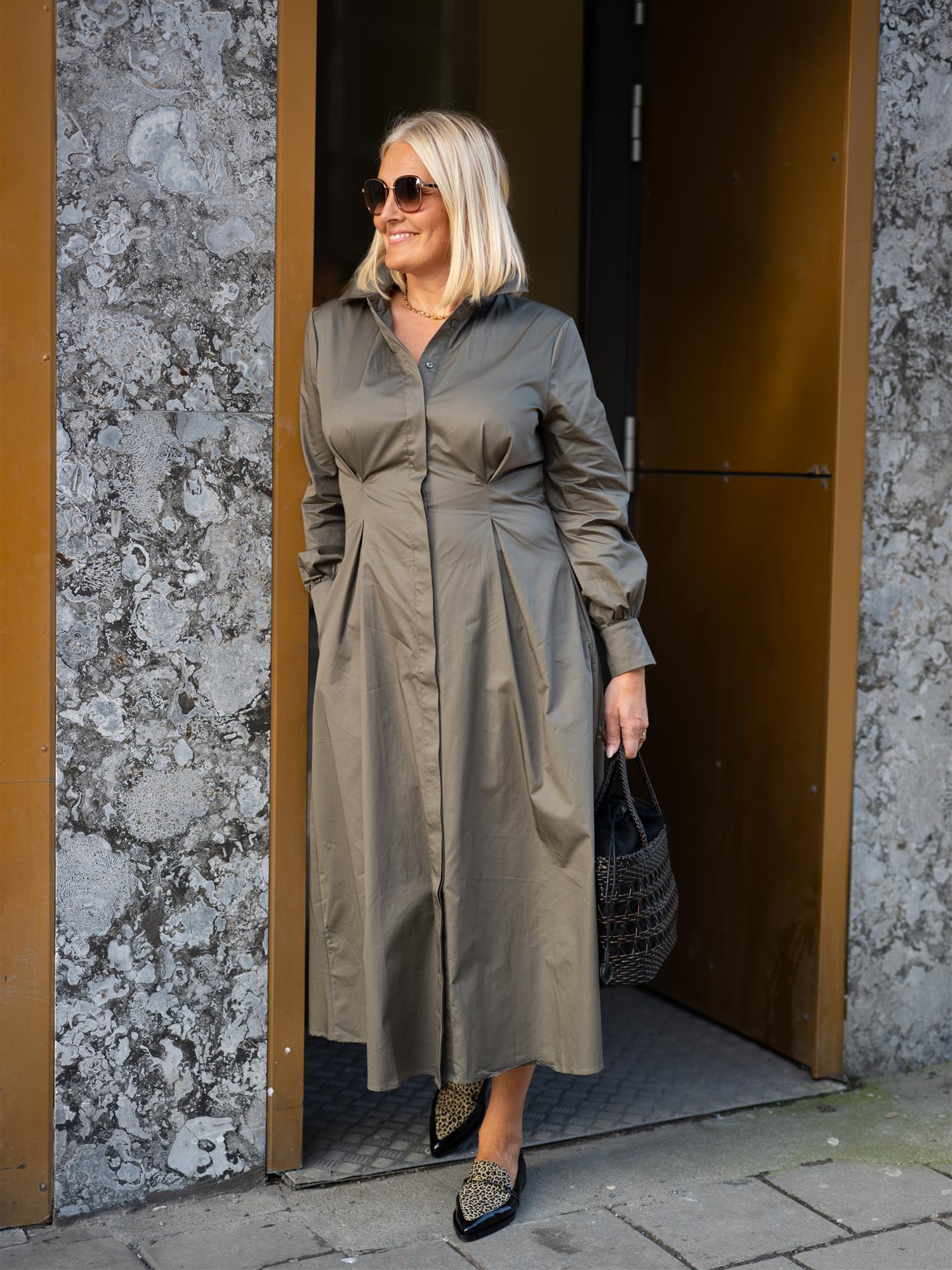 Delikat og feminin kjole i en sofistikert army-grønn farge. Kjolen har en flatterende midilengde med en lett A-formet silhuett som gir bevegelsesfrihet og komfort, samtidig som den fremhever figurens naturlige linjer.
