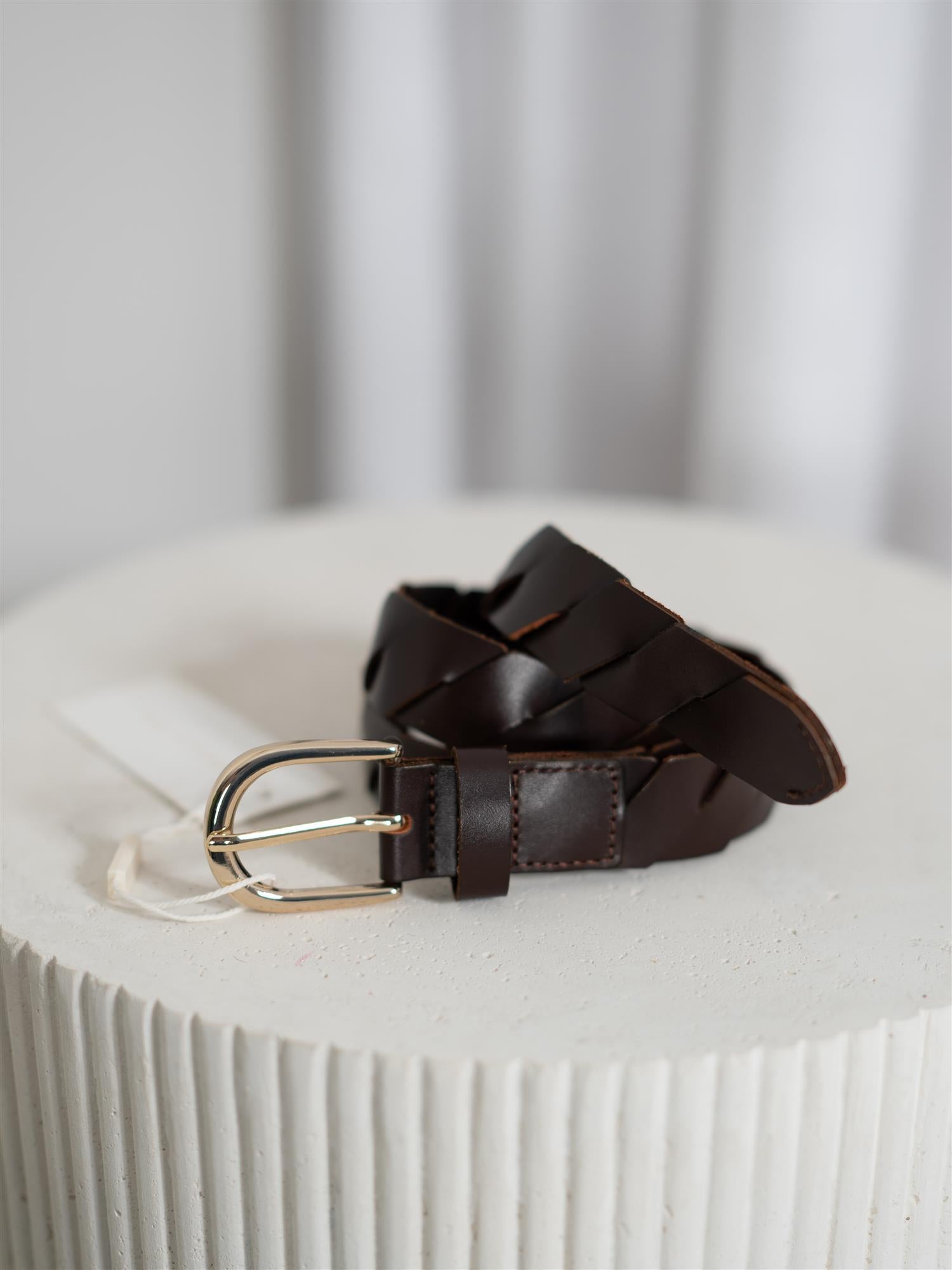 Lekkert flettet belte i mørkebrunt fra Camilla Pihl. Beltet har en gullfarget tidløs buet spenne. Allsidig størrelse da spennen kan festes hvor som helst i det flettede mønsteret.