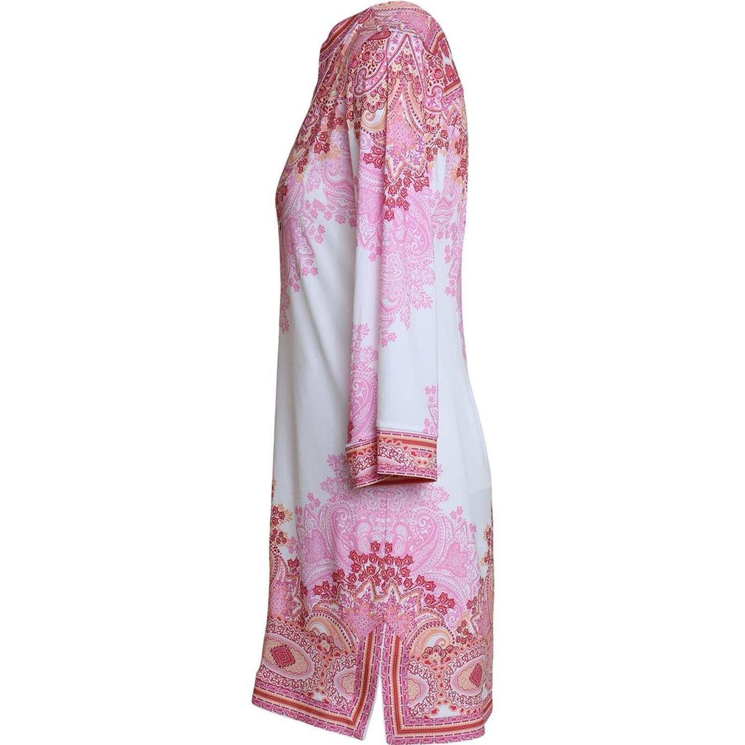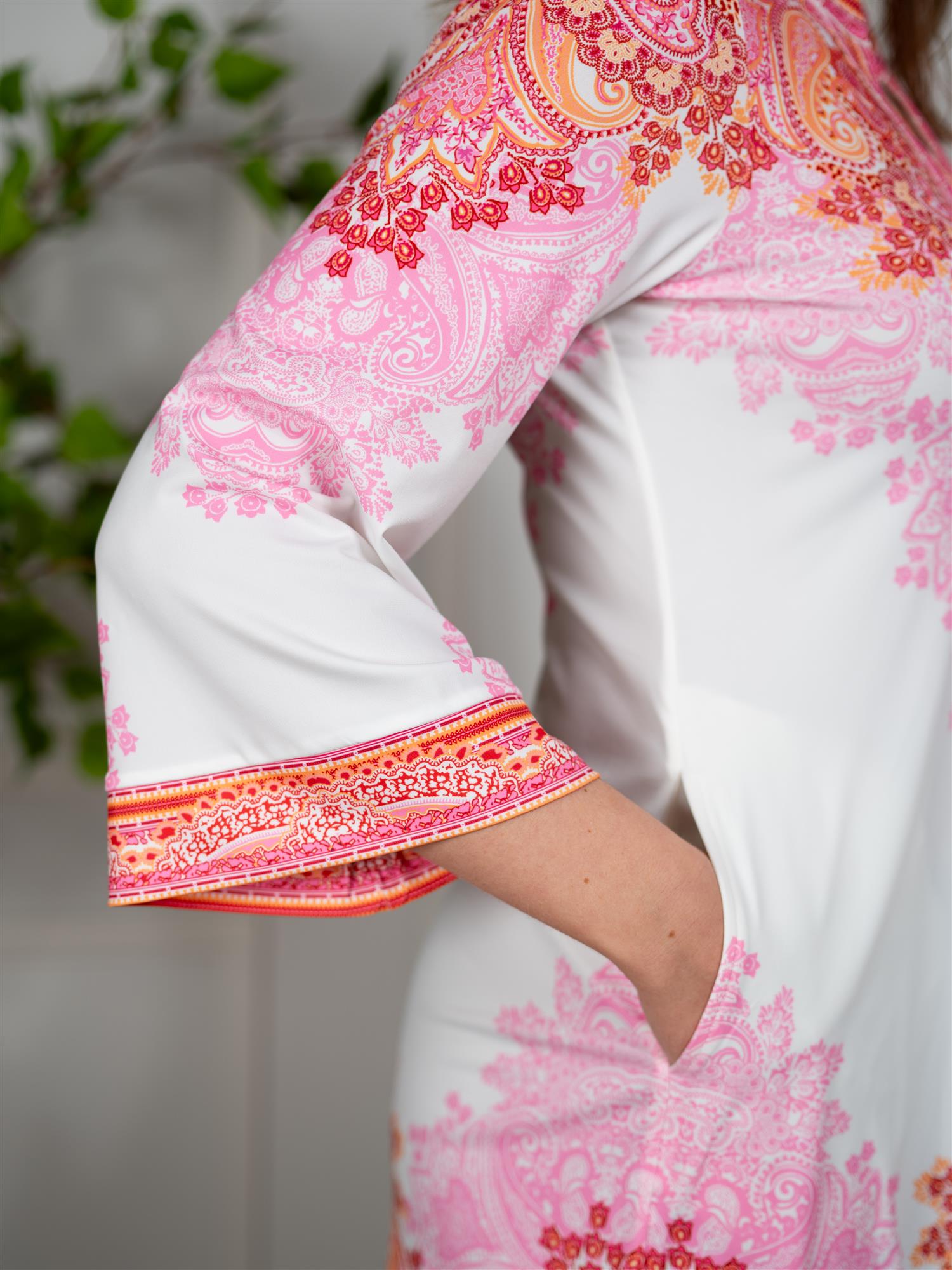 Keyla-kjolen i en vakker rosafarge er et perfekt valg for enhver anledning. Den kombinerer stil og komfort, og gir deg en flatterende silhuett. Den har vide ermer og v-hals med lekre knapper som gir det lille ekstra. Den har god lengde og en liten splitt i hver side. Dette er en kjole som faller fint og den har skrålomme i hver side.