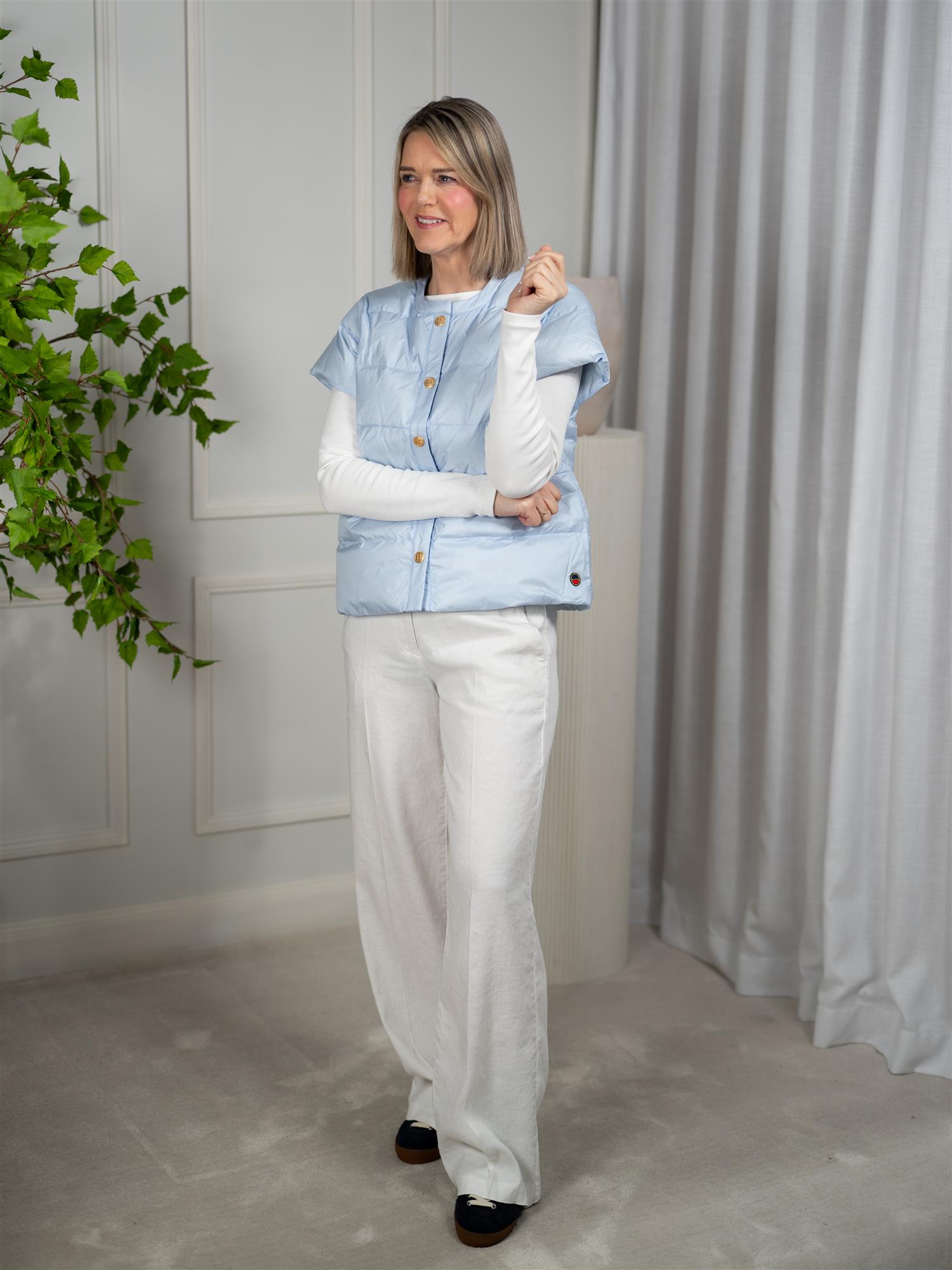 Indie Down Jacket er en lett dunvest med korte t-skjorteermer. Den har rund hals, skjulte lommer og gullknapper med magnetlukking. Den er perfekt for bruk både innendørs og utendørs.