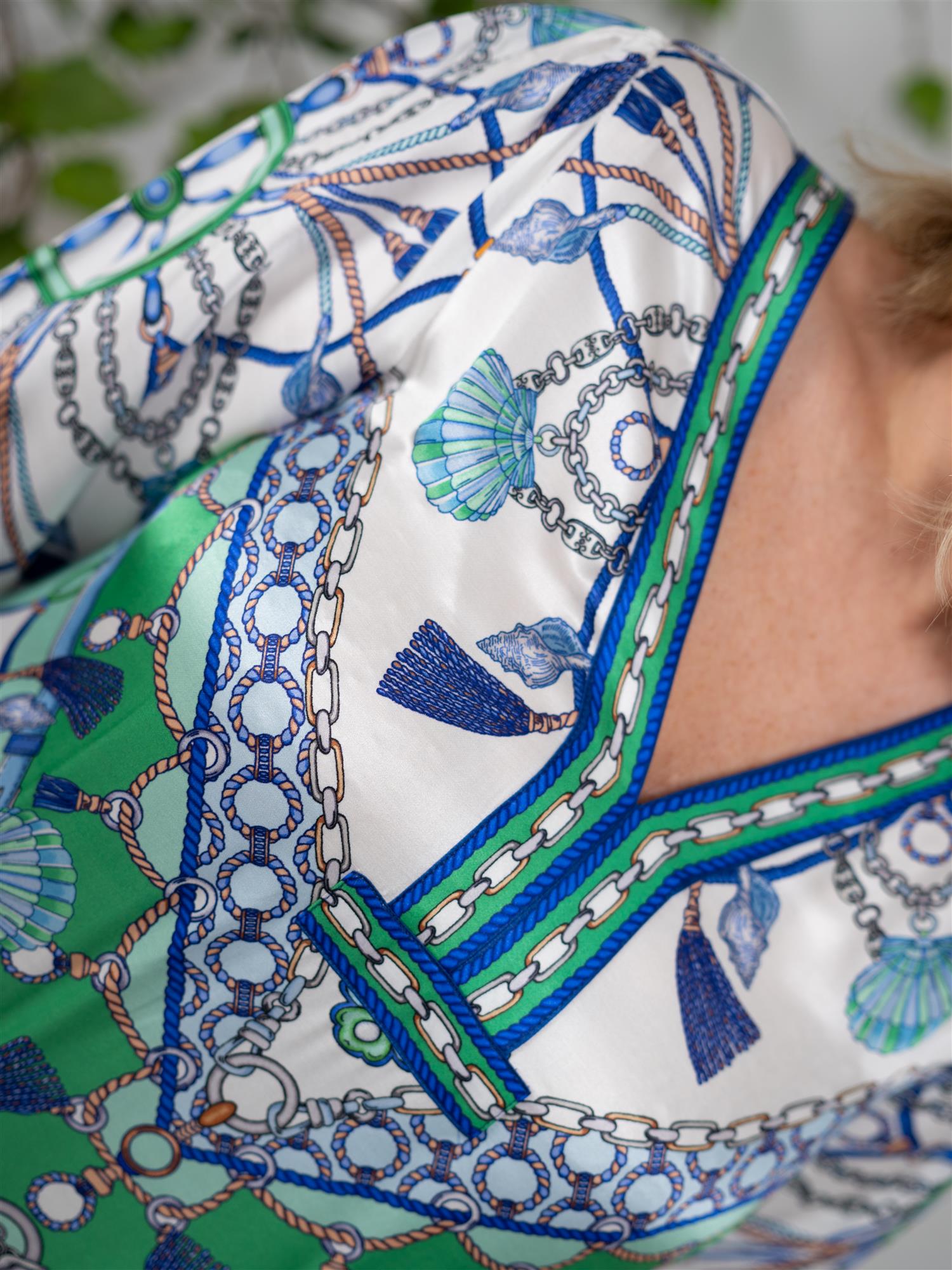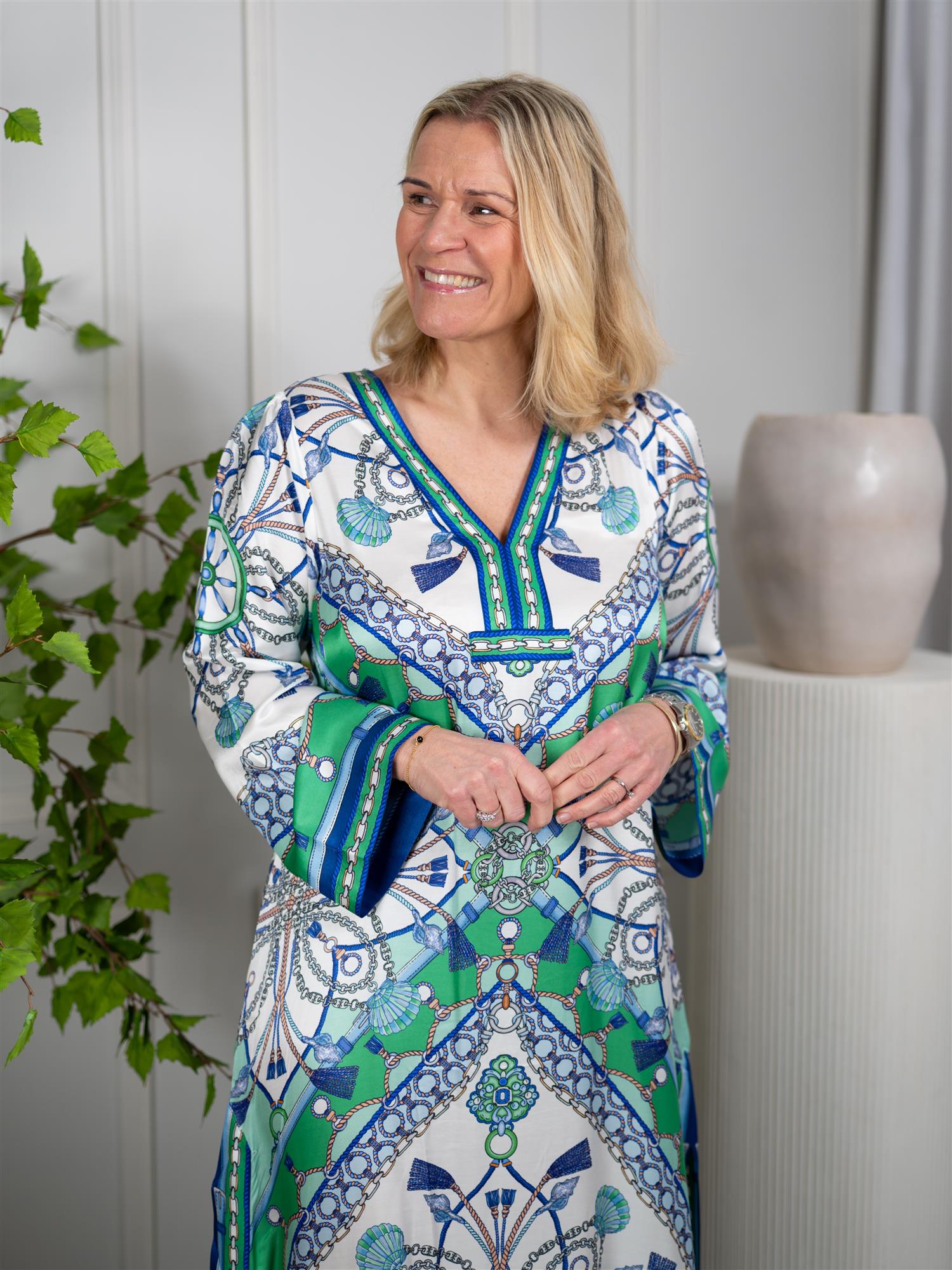 Tilføy et elegant preg i garderoben din med Laylani maxi-kjolen fra Hale Bob, i en vakker blåfarge. Denne kjolen gir en luksuriøs følelse og en flatterende passform. Perfekt for spesielle anledninger, vil denne kjolen garantert få deg til å føle deg fantastisk. Kjolen har vide ermer, delikat V-utringning og splitt i sidene.