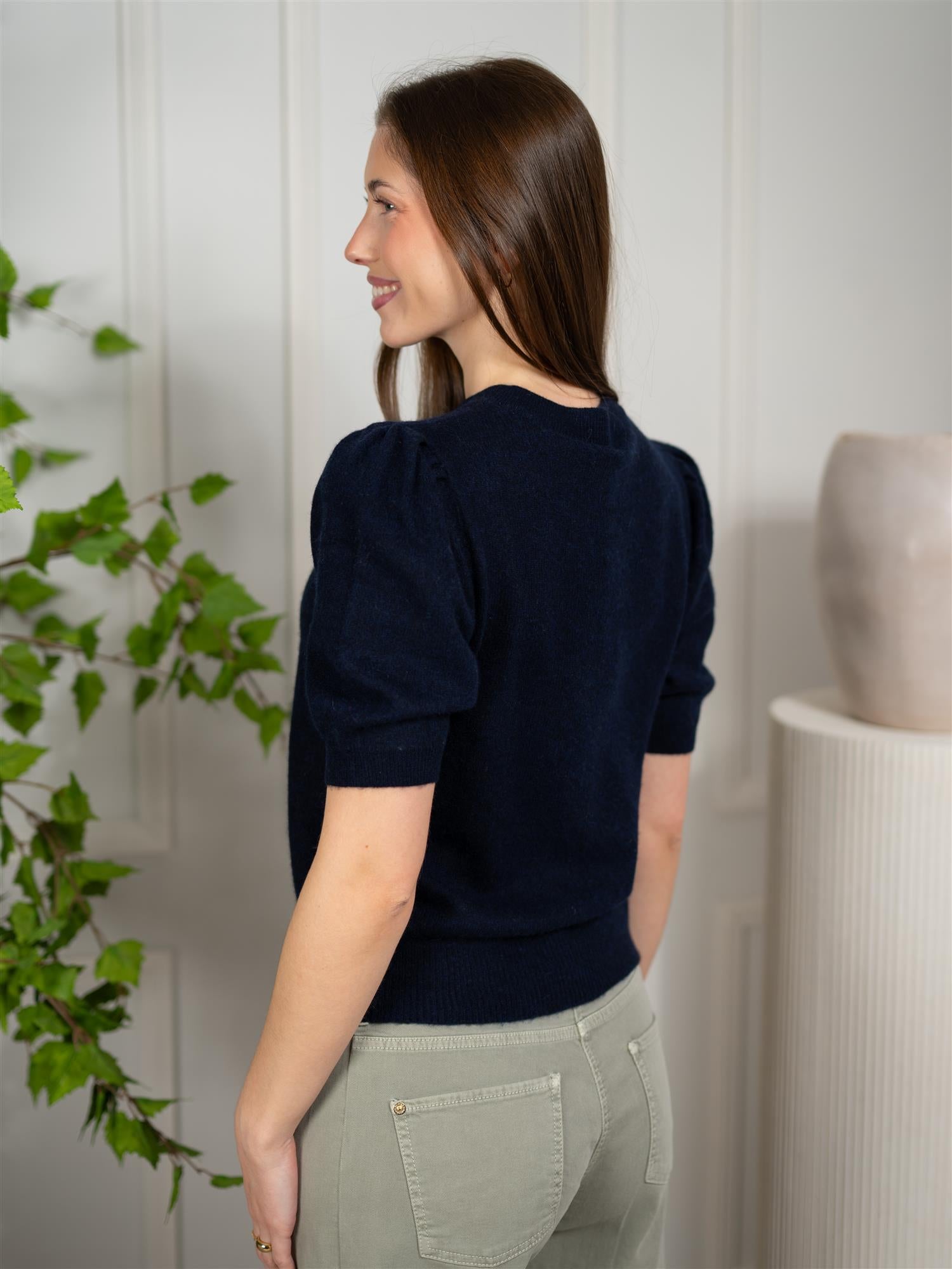 Nydelig strikket topp fra Davida i elegant mørkeblå farge. Denne er designet med rund hals, korte ermer, knapper i front og puffede skuldre. Utrolig myk og god kvalitet.