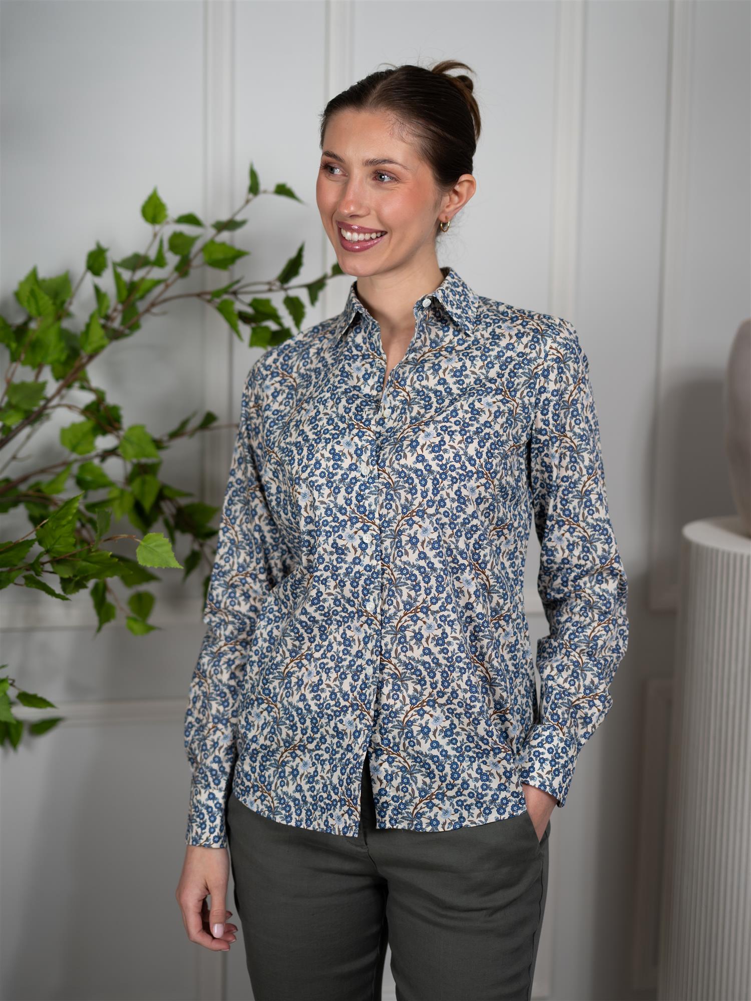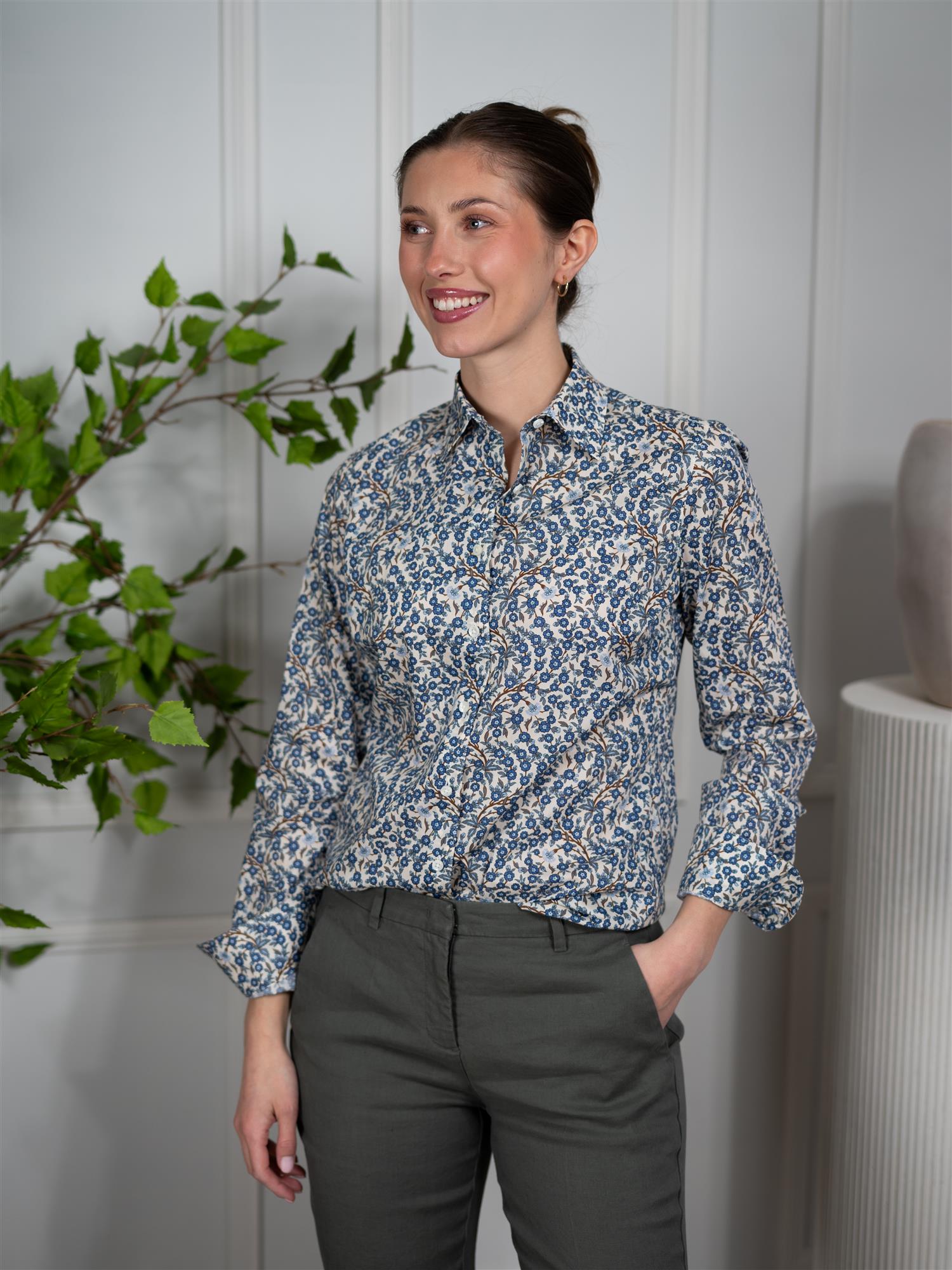 Tidløs og elegant bomull skjorte i blomstrete mønster i blå toner fra Stenströms. Den er rett i modellen med krage, enkle mansjetter og knapper i front. Skjorte er laget av bomull. Fin til både jeans, shorts og skjørt!