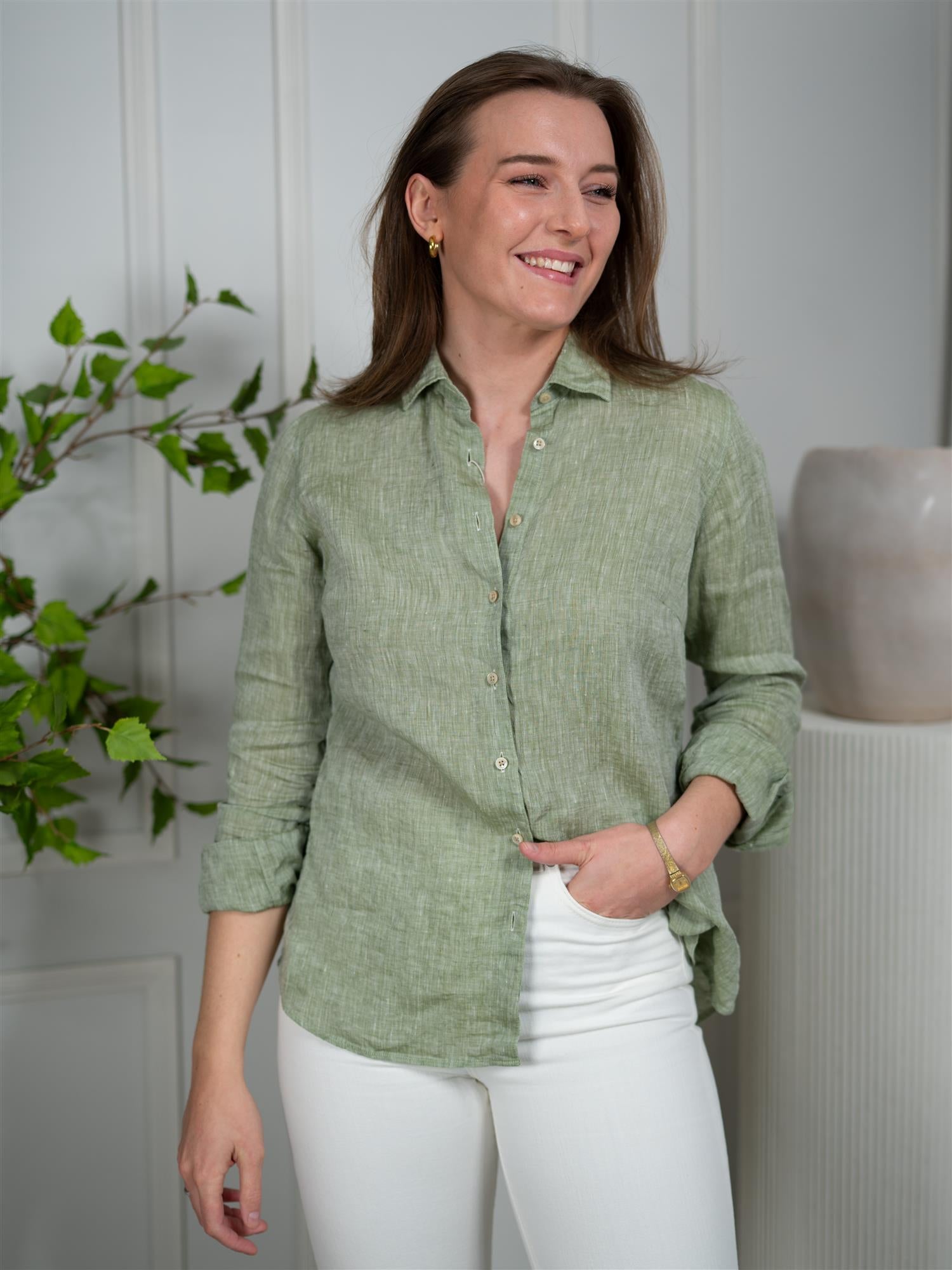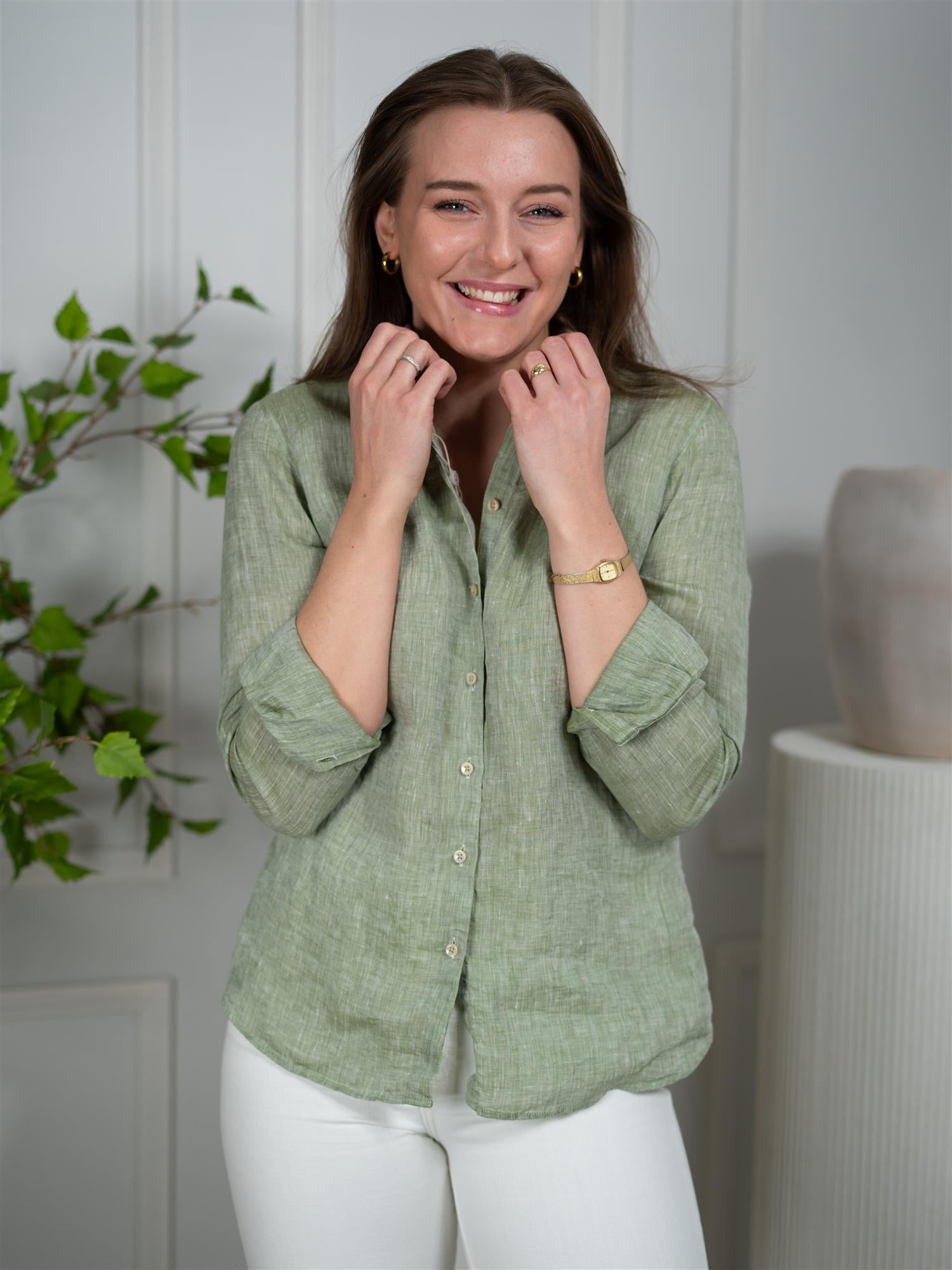 Tidløs og elegant lin skjorte i en lys grønn farge fra Stenströms. Den er rett i modellen med krage, enkle mansjetter og knapper i front. Skjorte er laget av lin, noe som gir den en lett og luftig følelse og er fin på varme dager. Fin alene eller bruk over en singlet, til både jeans, shorts og skjørt!