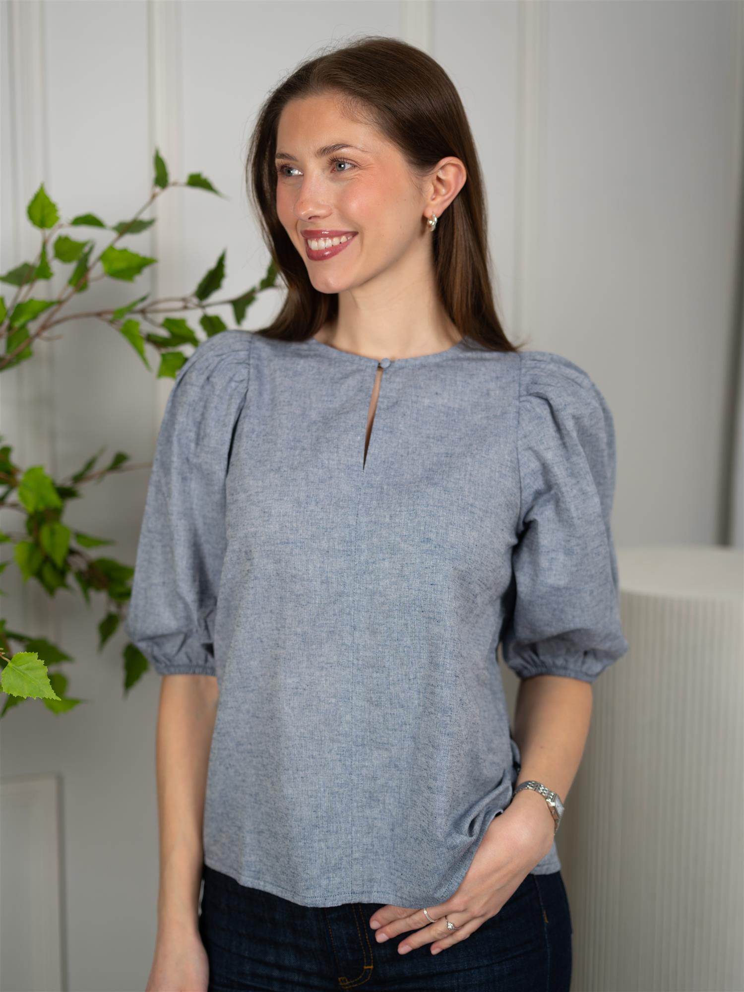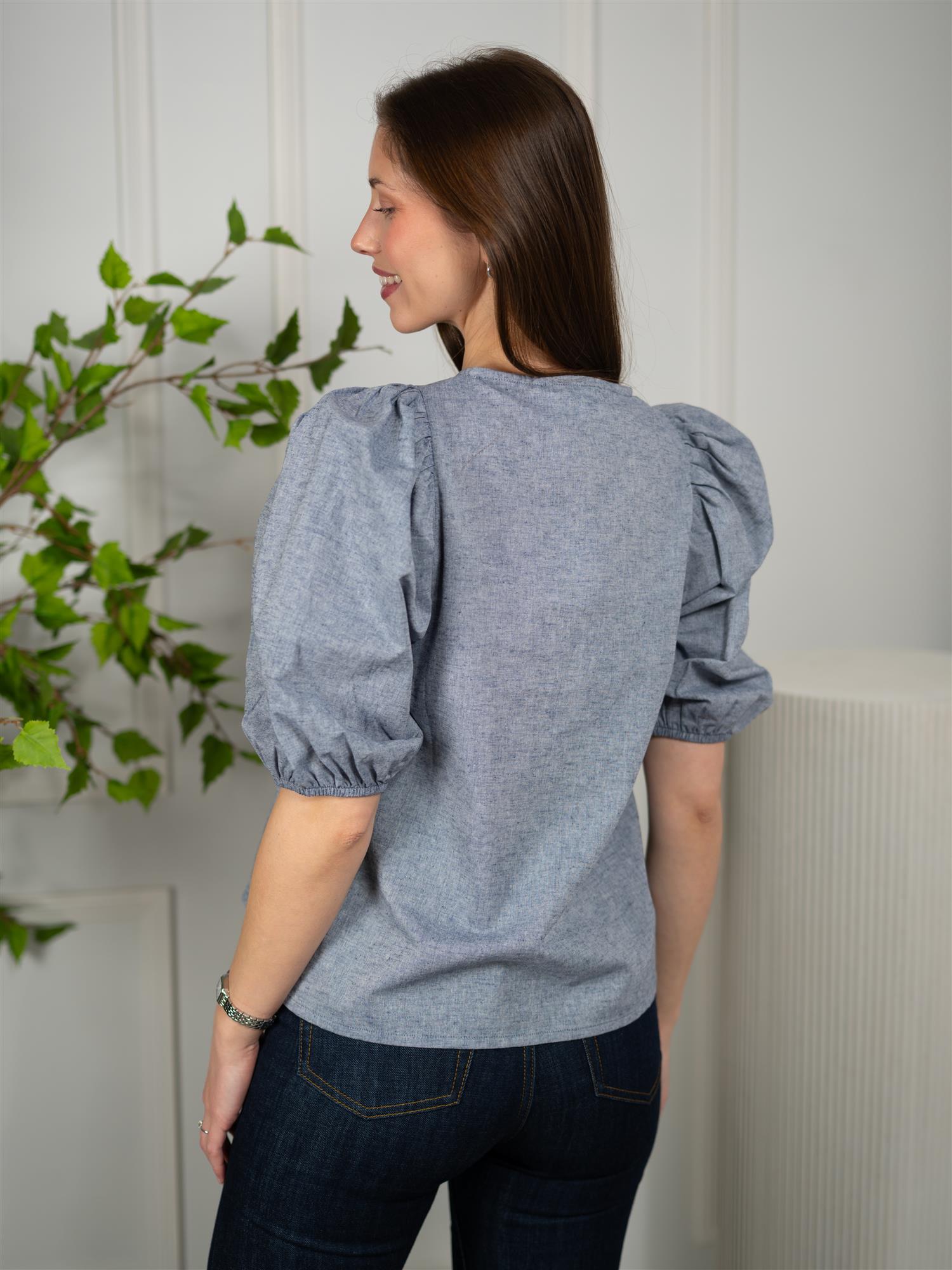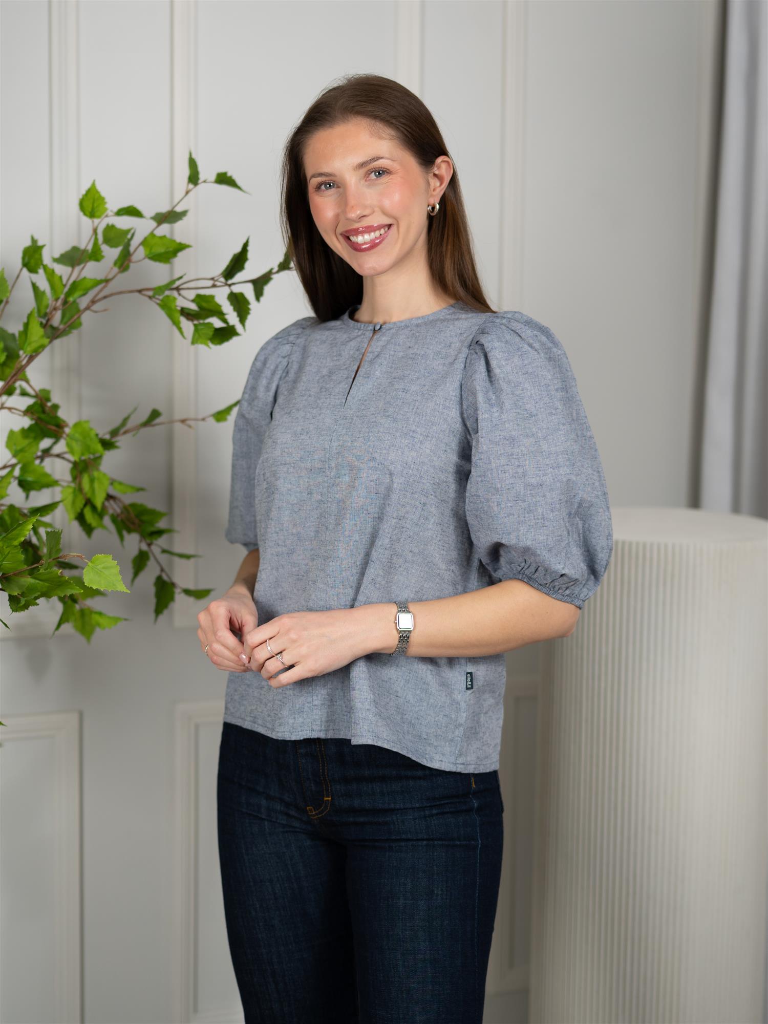 Toppen har en rund hals med knapp og rynkede skuldre, samt vide ermer med elastiske bånd som stopper før albuen. som gir et moderne og elegant preg. Linmaterialet gir et naturlig og luftig uttrykk, noe som gjør toppen behagelig å bruke på varmere dager.