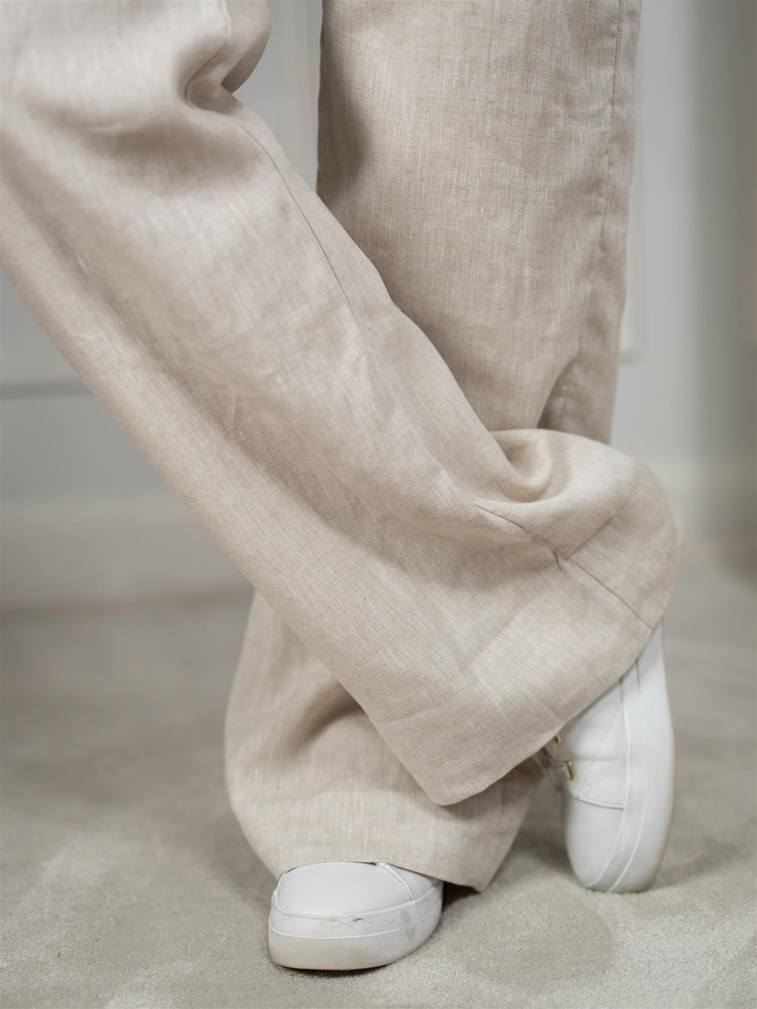 Buksen har en avslappet og flatterende passform med rette ben som gir et tidløst og komfortabelt uttrykk. Linmaterialet gir et naturlig og luftig preg, noe som gjør buksen behagelig å bruke på varmere dager.