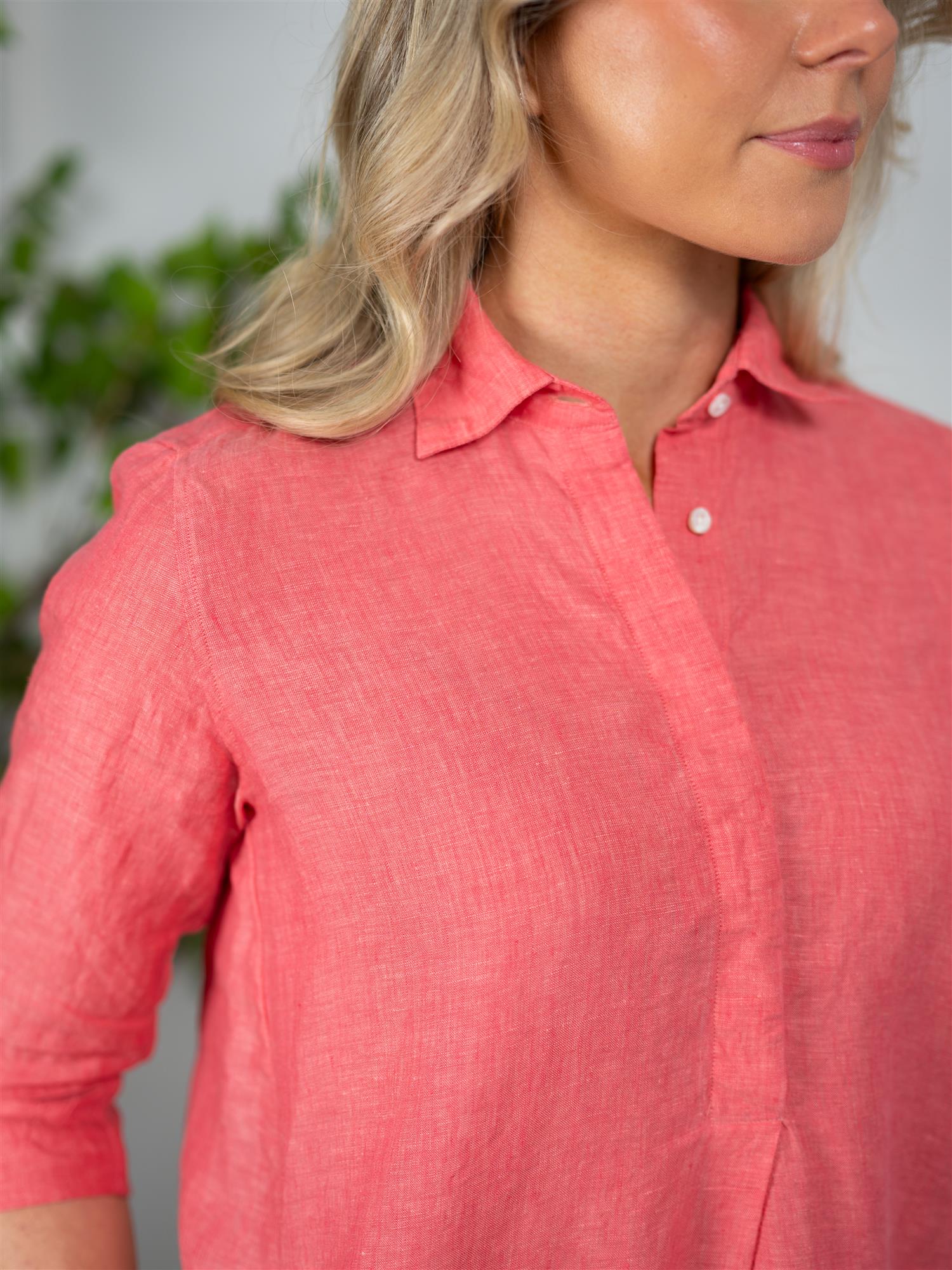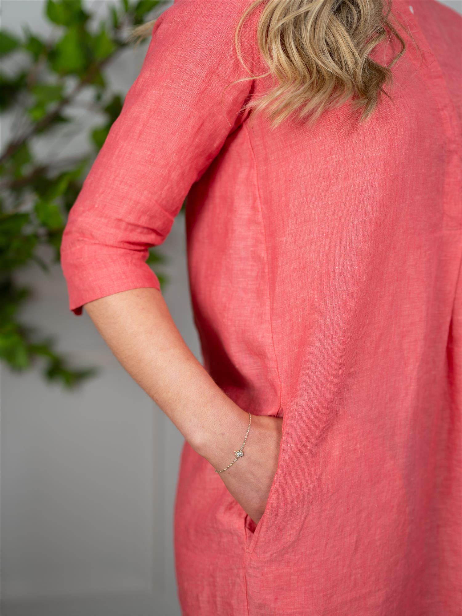 Kjolen har halv knappelukking med skjulte knapper i front, klassisk skjortekrage og 3/4-lange ermer som gir et sofistikert og gjennomført preg. Den lette og stilrene utformingen gjør den til et naturlig valg i sommergarderoben. Perfekt å style med sandaler for et avslappet uttrykk, eller med sneakers for en mer casual og moderne look hverdagslook.