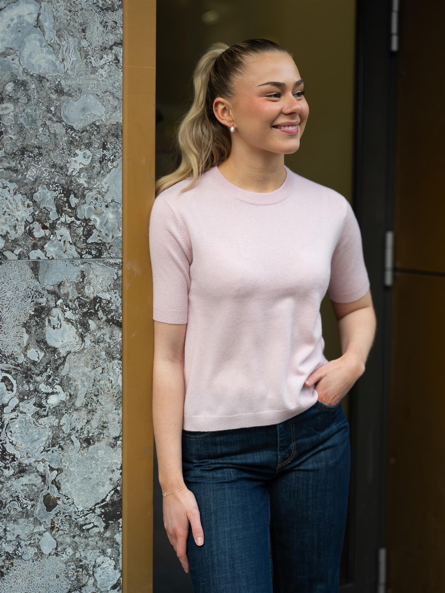 Tynn strikket T-skjorte fra Stenströms til dame, i lekker dus rosa. Den strikkede T-skjorten er designet med normal passform, rund hals, korte ermer og ribbestrikkede kanter. Normal lengde og nydelig kvalitet.