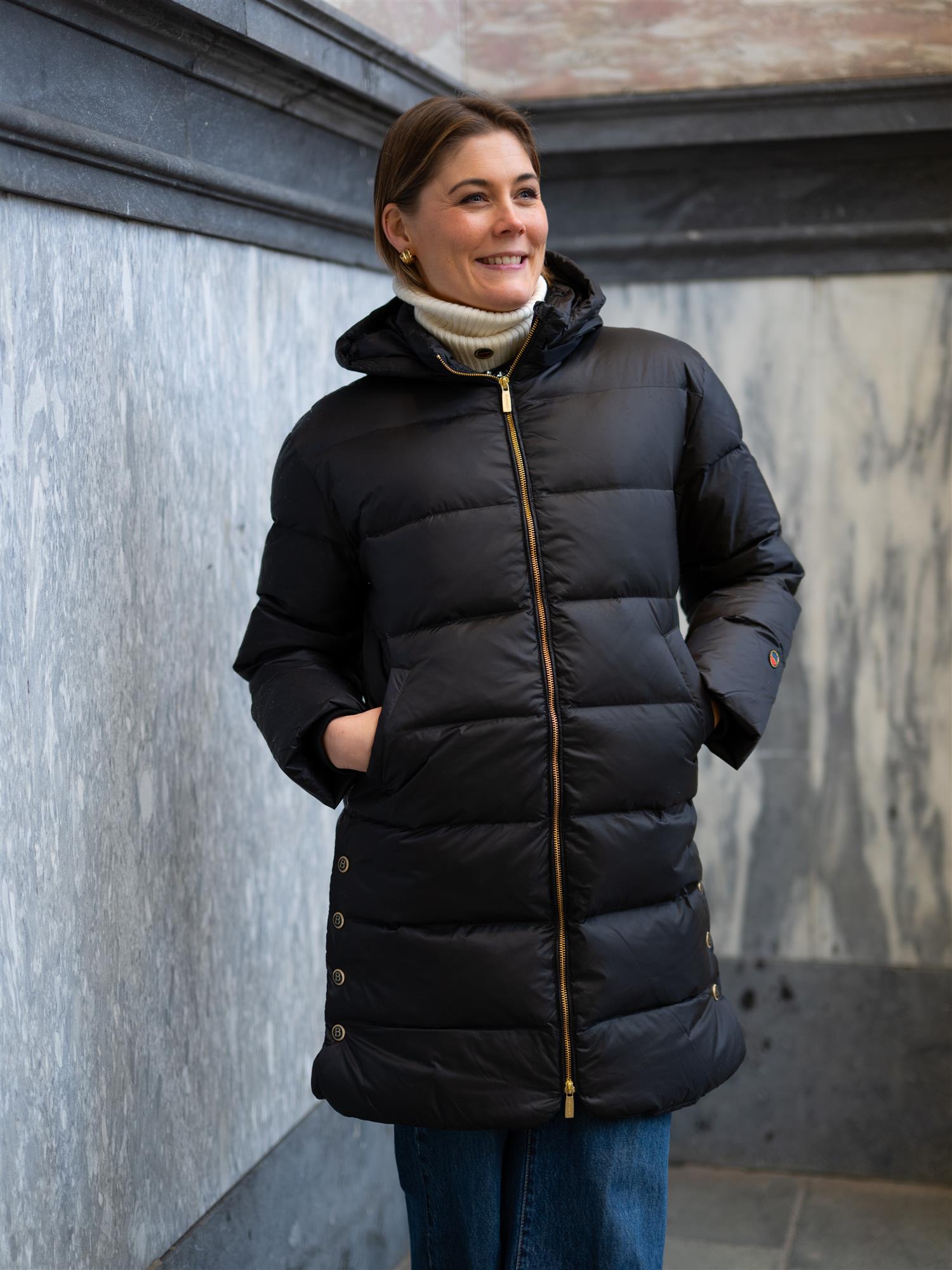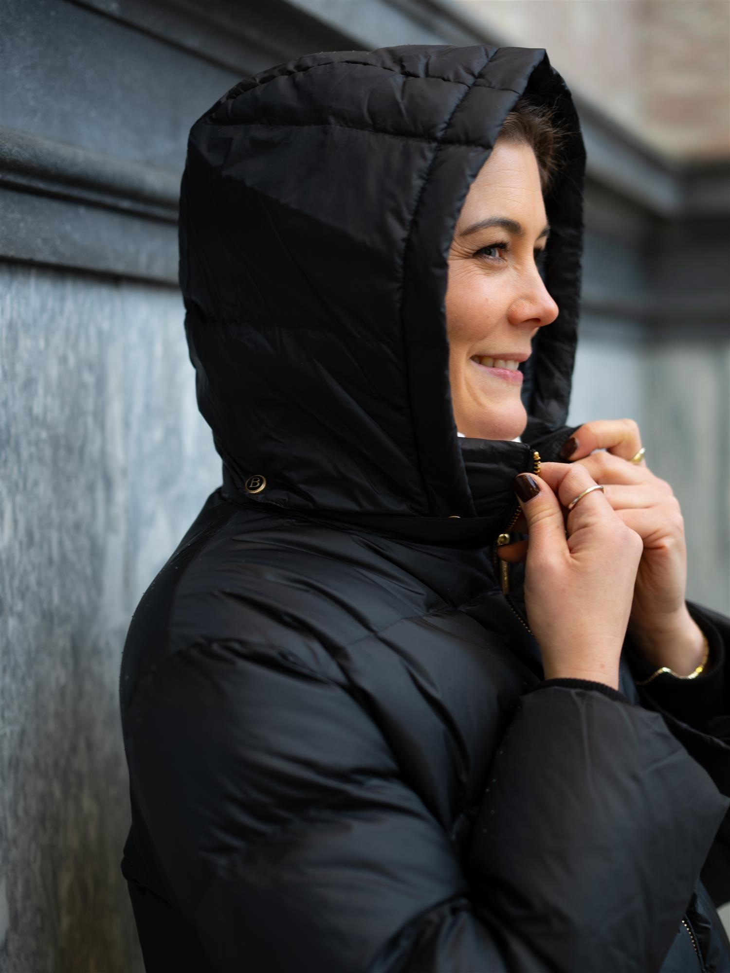 Lekker og lett dunkåpe i klassisk sort fra Busnel. Kåpen har splitt i siden med Busnels ikoniske gullknapper. Hetten er avtagbar for allsidighet.