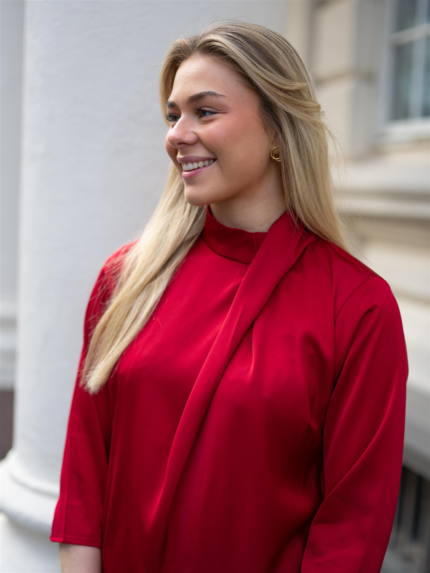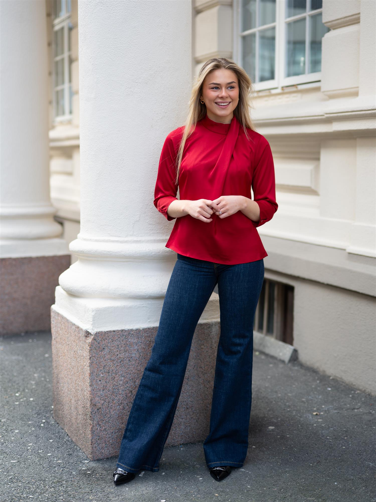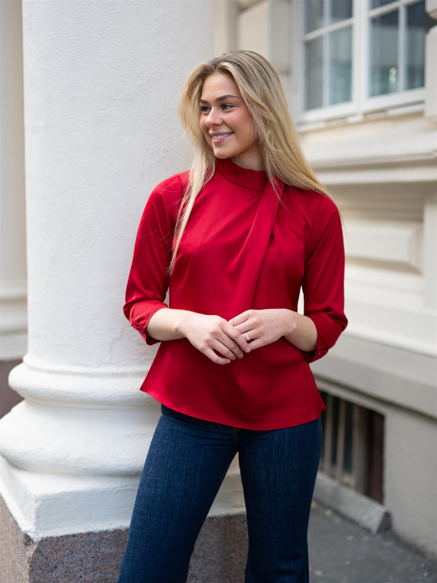 Elegant bluse fra Riccovero i en lekker rødfarge. Blusen har 3/4 ermer med en liten knappeåpning ved albuen. Blusen er designet i et glansfullt stoff. Noel Top har noe forhøyet hals med overlappet detalj for både struktur og unikhet. En enkel bluse men som likevel har noe ekstra. Lite stretch. Lett innsving i midjen for feminin fasong.