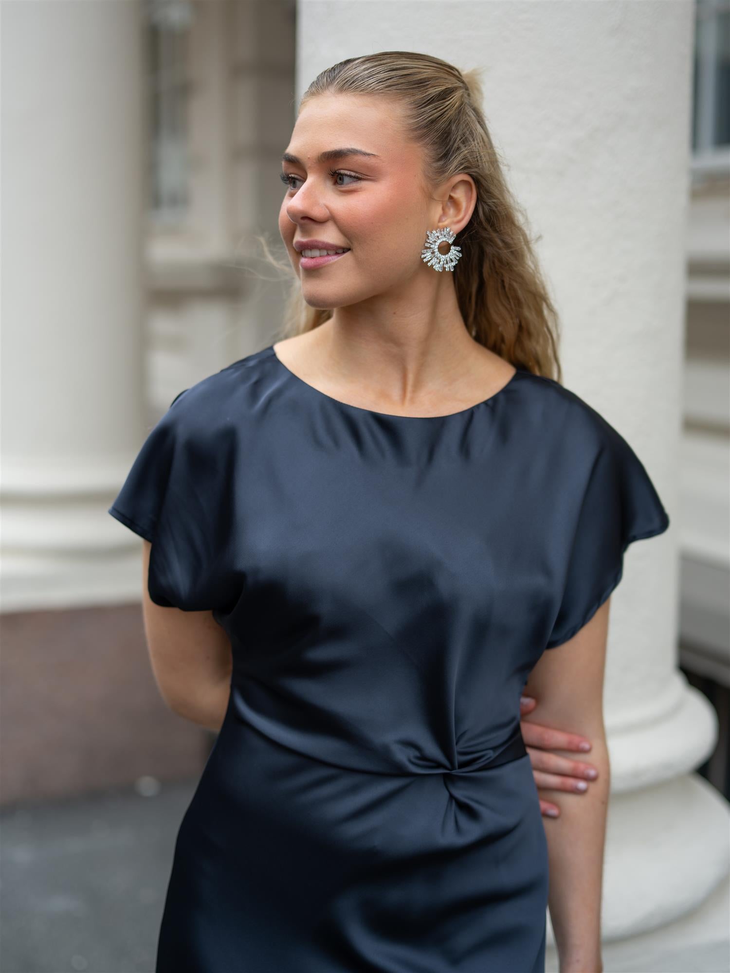 Nydelig kjole fra Riccovero i mørkeblå. God lengde med en feminin passform som er lett innsvinget i midjen. Splitt i sidene, klassisk round-neck og korte ermer. Lukkes med knapp bak i nakken, samt glidelås i siden.