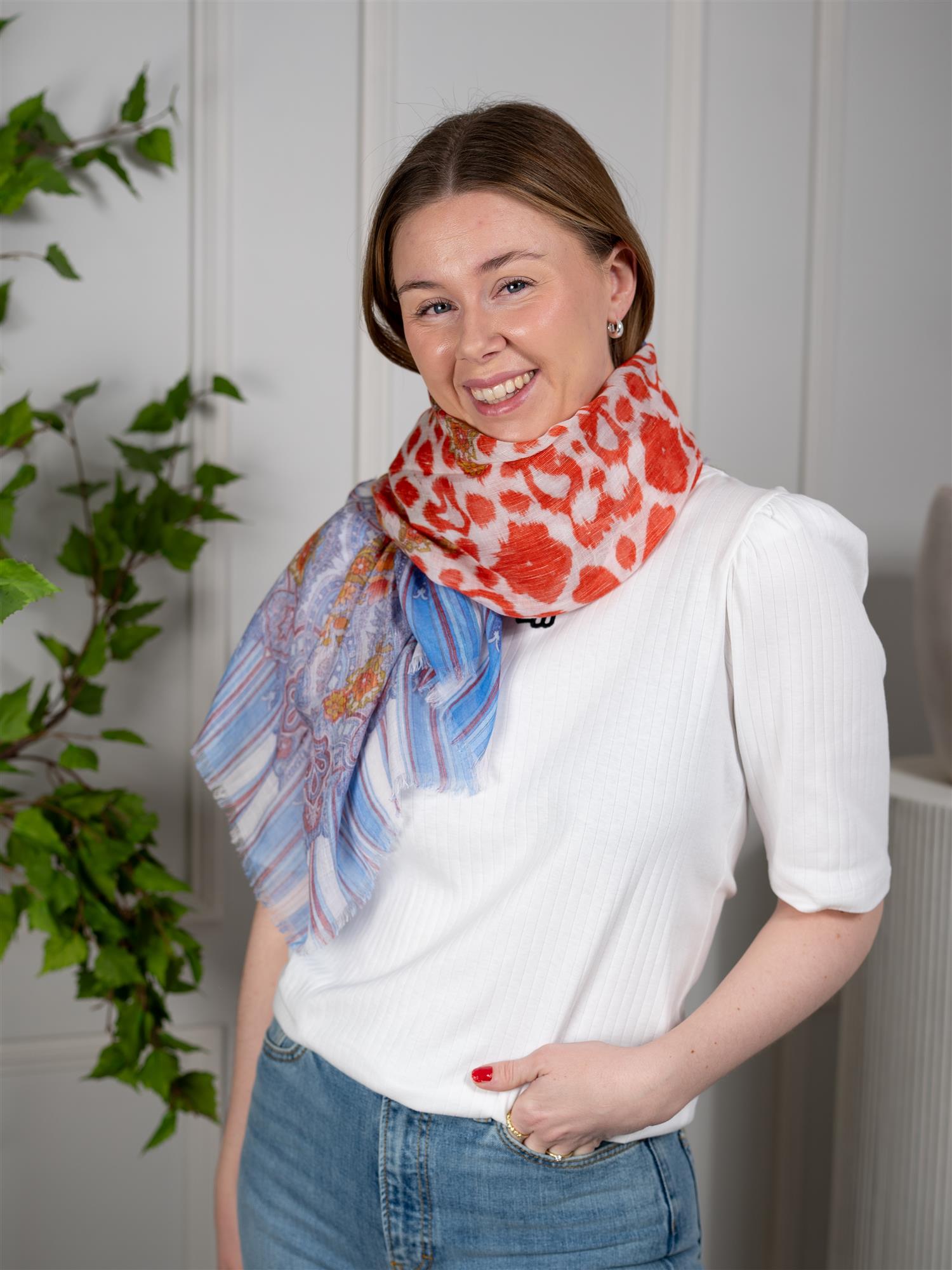 Lett og lekent skjerf i klassiske blåtoner med et hint av oransje som gir det lille ekstra! Dette skjerfet i deilig linblanding passer perfekt sammen med andre blåtoner og gir alle jeans et løft! Bruk til som både skjerf og sjal over en kjole!