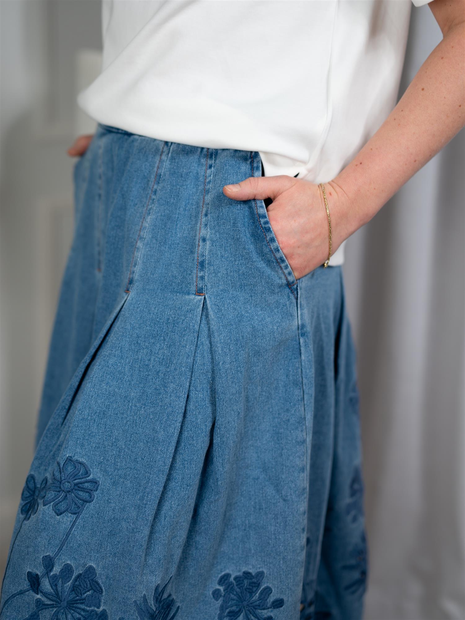 Dette denimskjørtet kombinerer et tidløst uttrykk med feminine detaljer. De delikate broderiene med blomster- og bladmønster langs nederkanten gir plagget et unikt og dekorativt preg. Skjørtet har en flatterende A-linjeform med synlige sømmer som fremhever silhuetten, samt praktiske sidelommer for en avslappet og funksjonell stil.