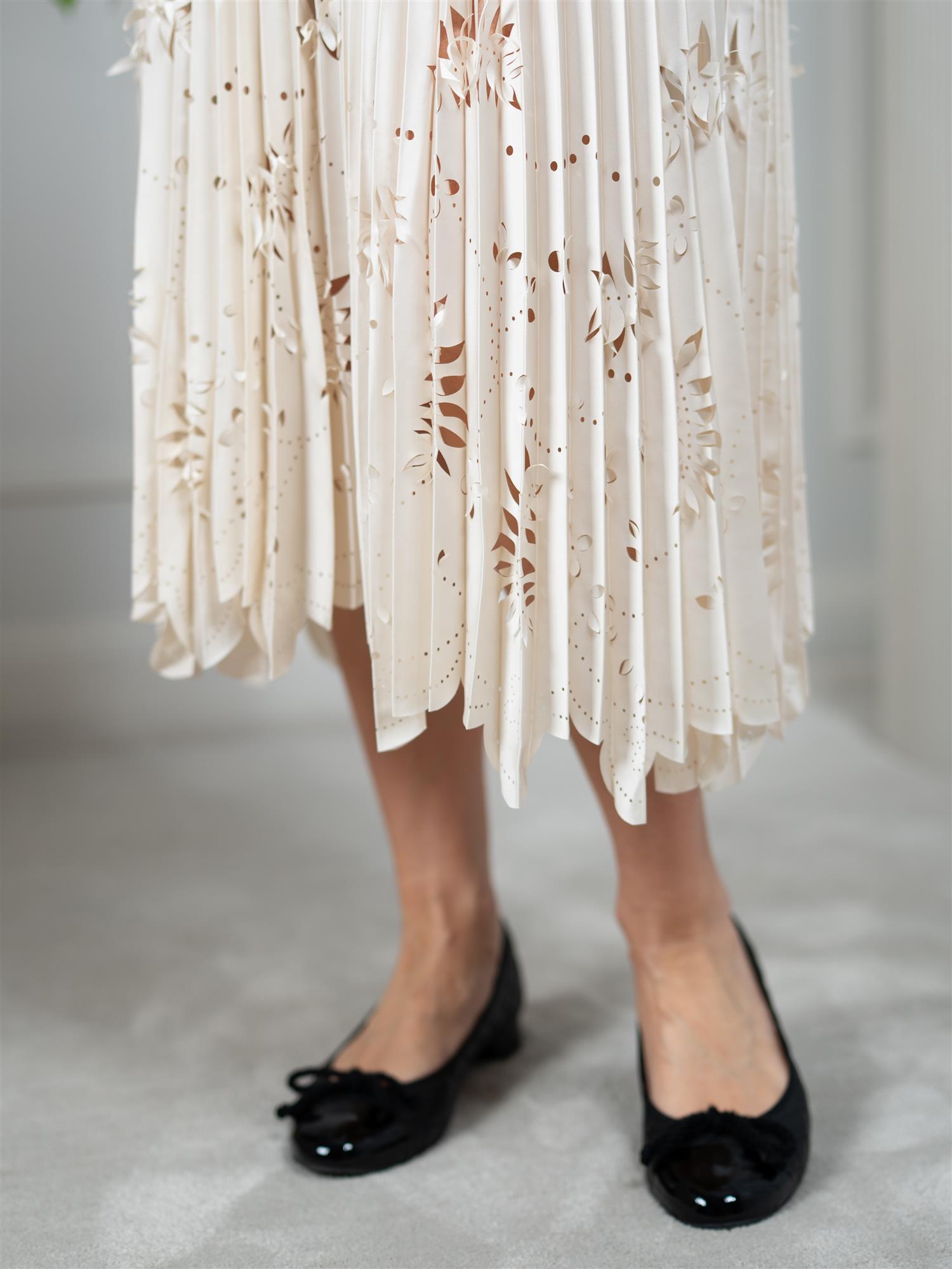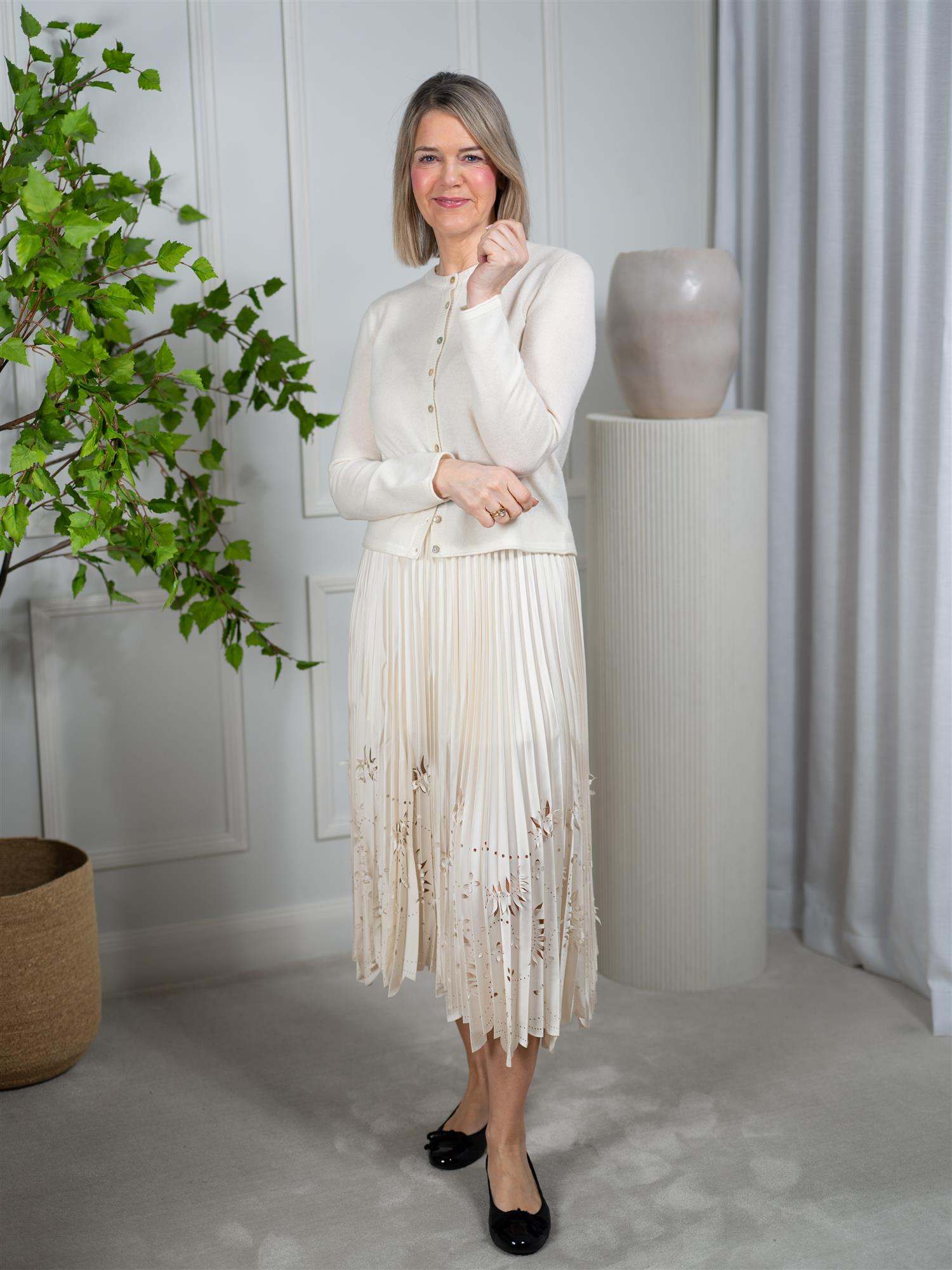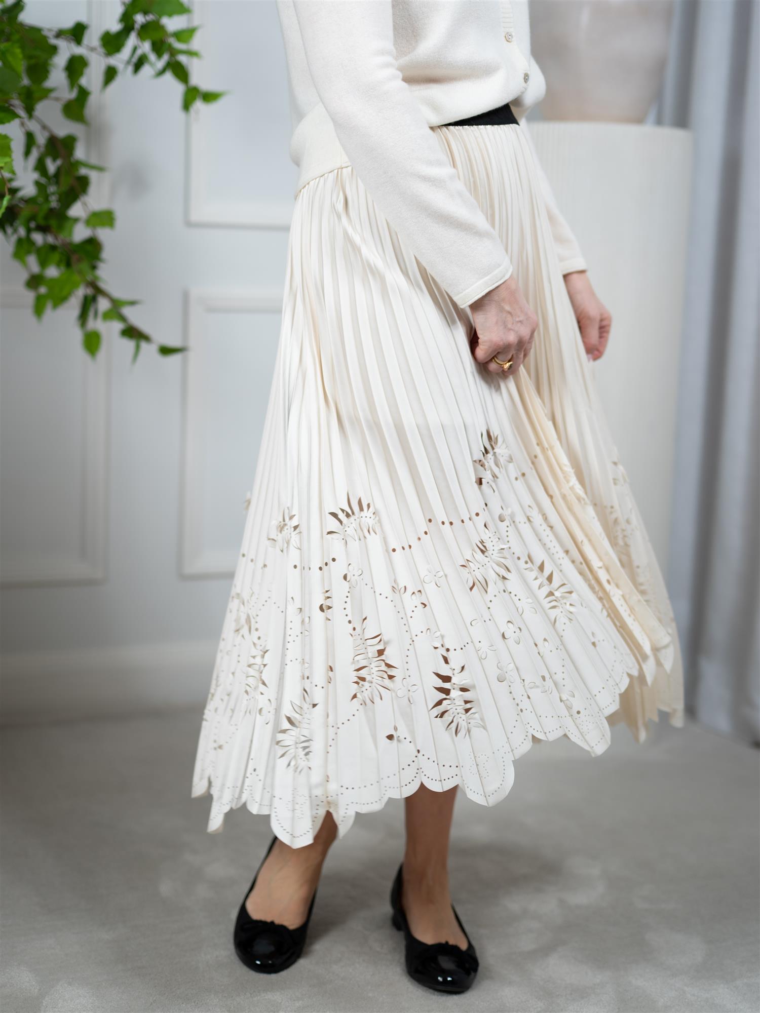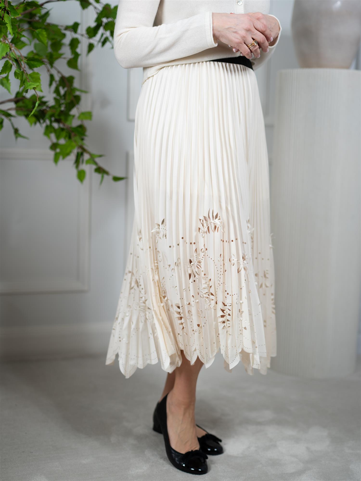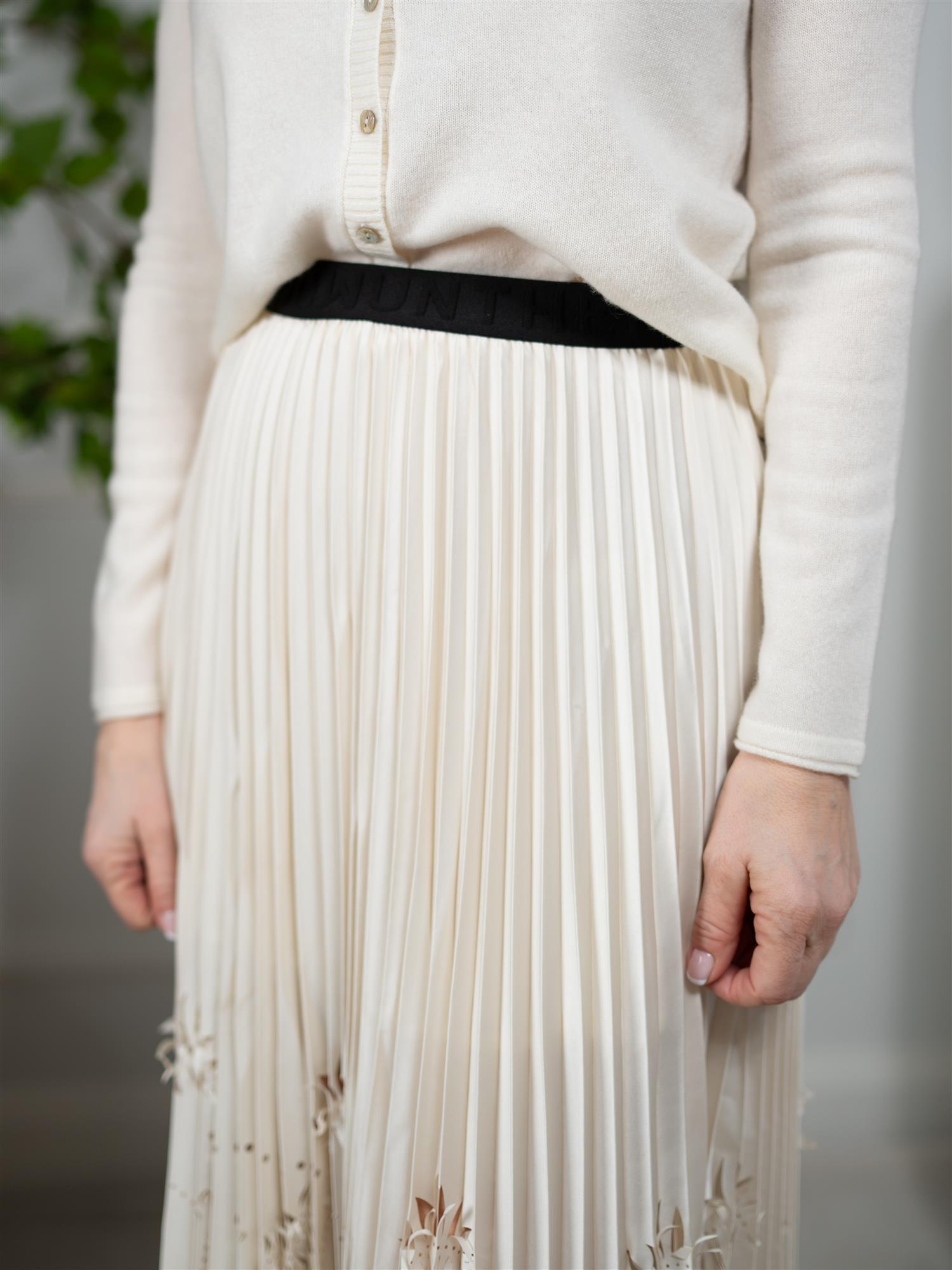 Et røft og elegant skjørt i beige med sort kant i livet fra Munthe. Plissetskjørtet har vakre laserskårne detaljer. Designet med en elastisk sort linning utsmykket med en diskré MUNTHE-logo. God lengde. Perfekt for festlige anledninger.
