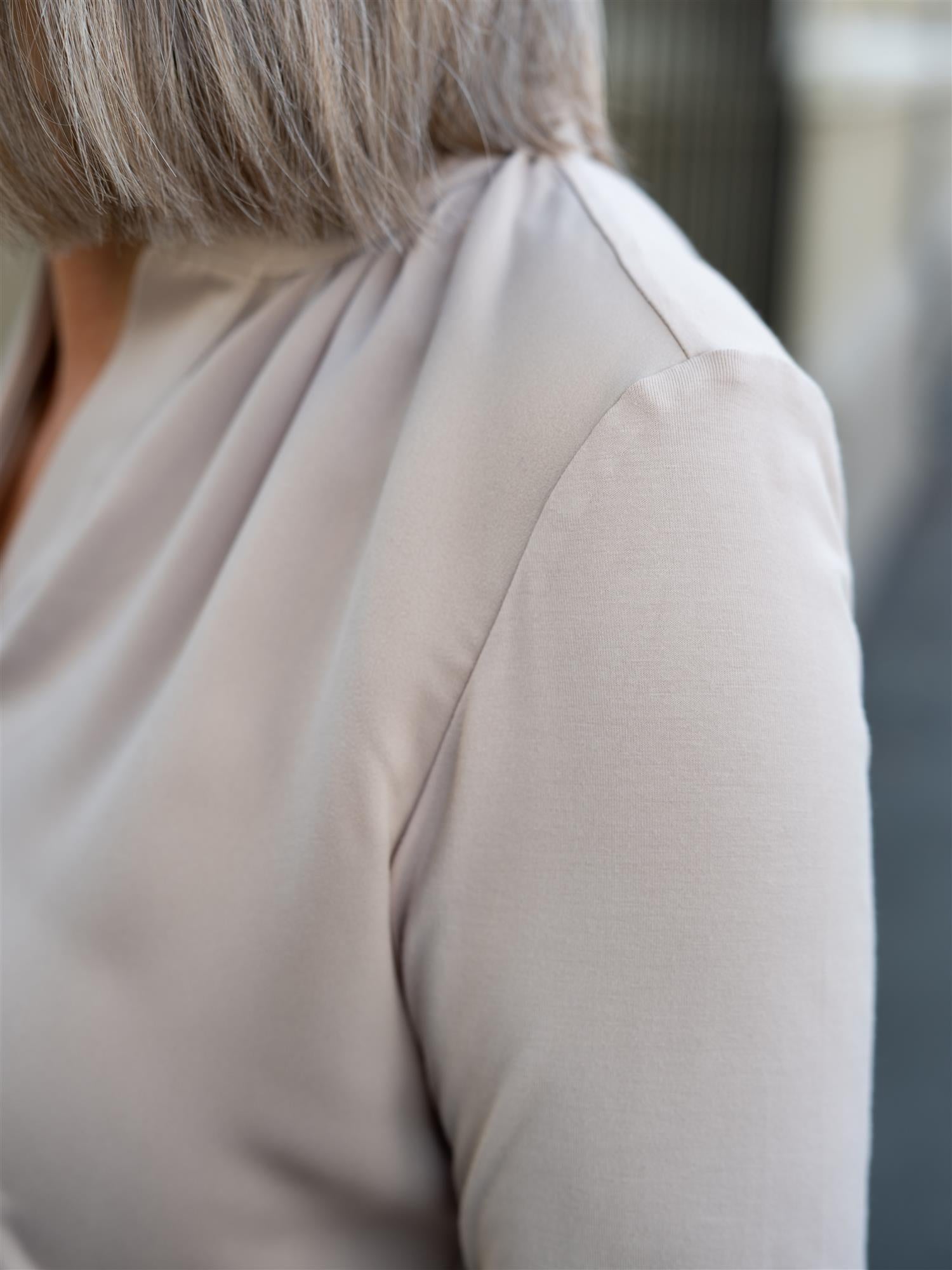 Riccovero Jenner Top i beige er en pen topp med v- hals og lange ermer. Den har elegant knappelukking nedover halsen, og en smal passform.