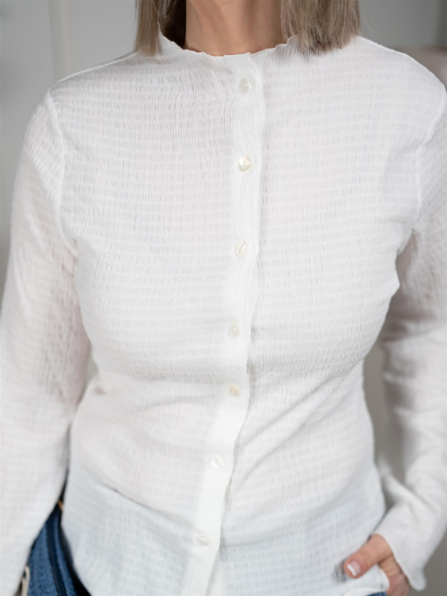 Lottie Crincle Top er en teksturert topp med bølgete babylock-detaljer på kragen, falden og ermekantene. Den har en sømløs krage, lett klokkeformede ermer og knapper midt foran for lukking. Toppen har god stretch og har en smal modell med vide ermer. Den er lett i kvaliteten med knapper i front og god lengde.