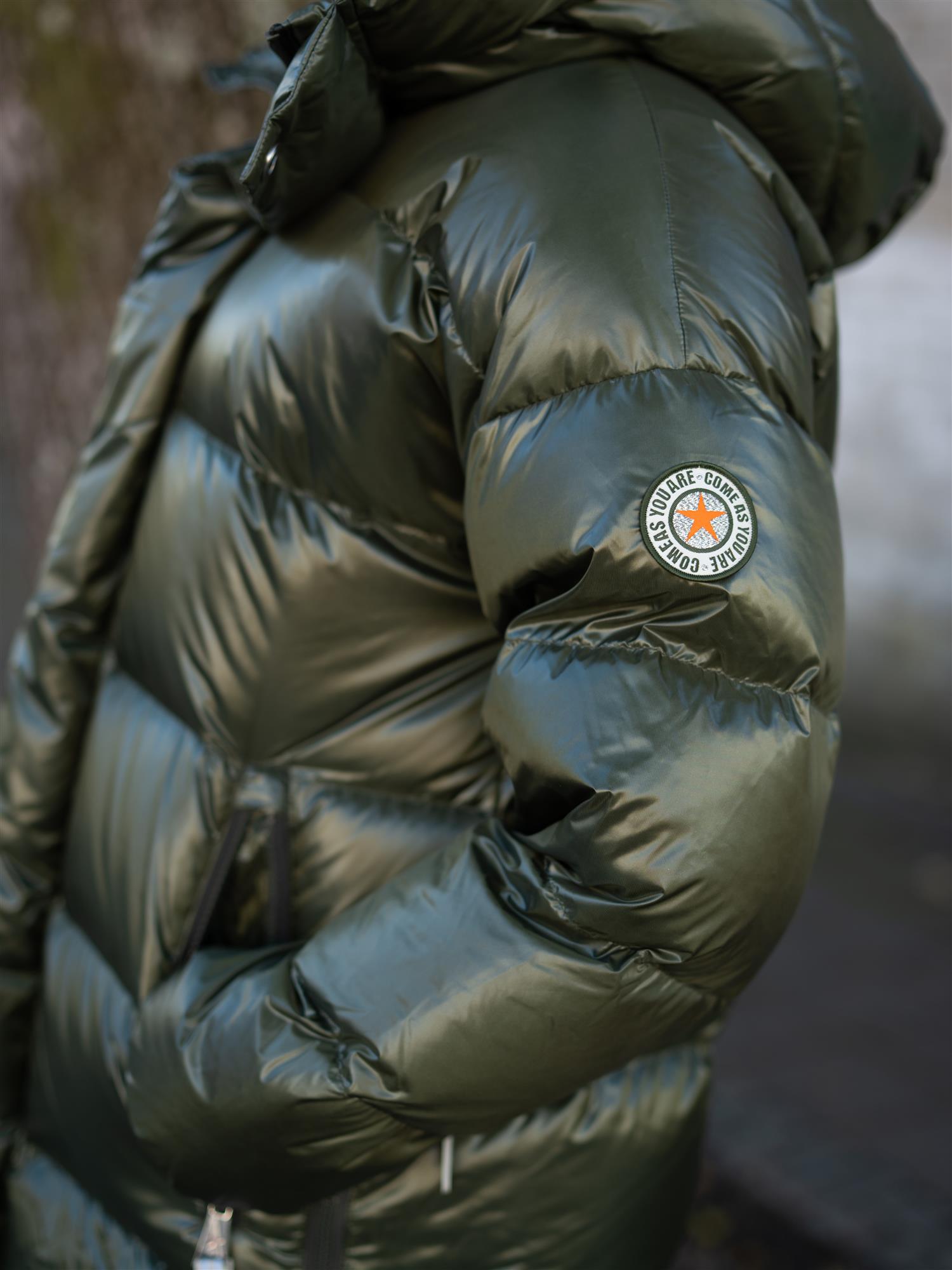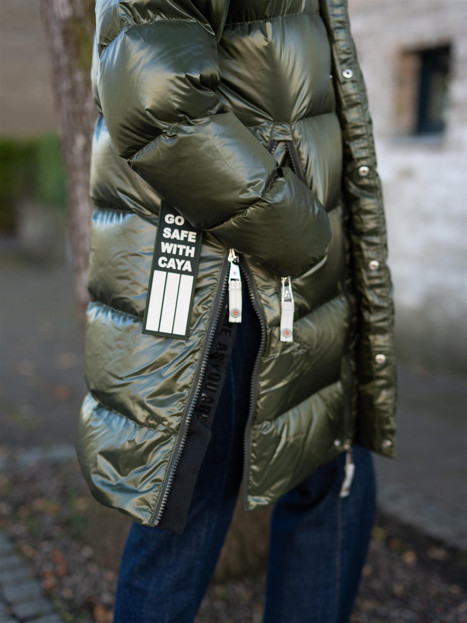 God og varm dunjakke fra CAYA i grønn. Jakken er stilfull og har middels lengde. Det er lommer og splitt i sidene. På innsiden av jakken er det stropper, slik at du kan ha jakken hengende over deg på ryggen uten å ha den over ermene. Jakken har kule detaljer som både gir deg en røff og sporty look.