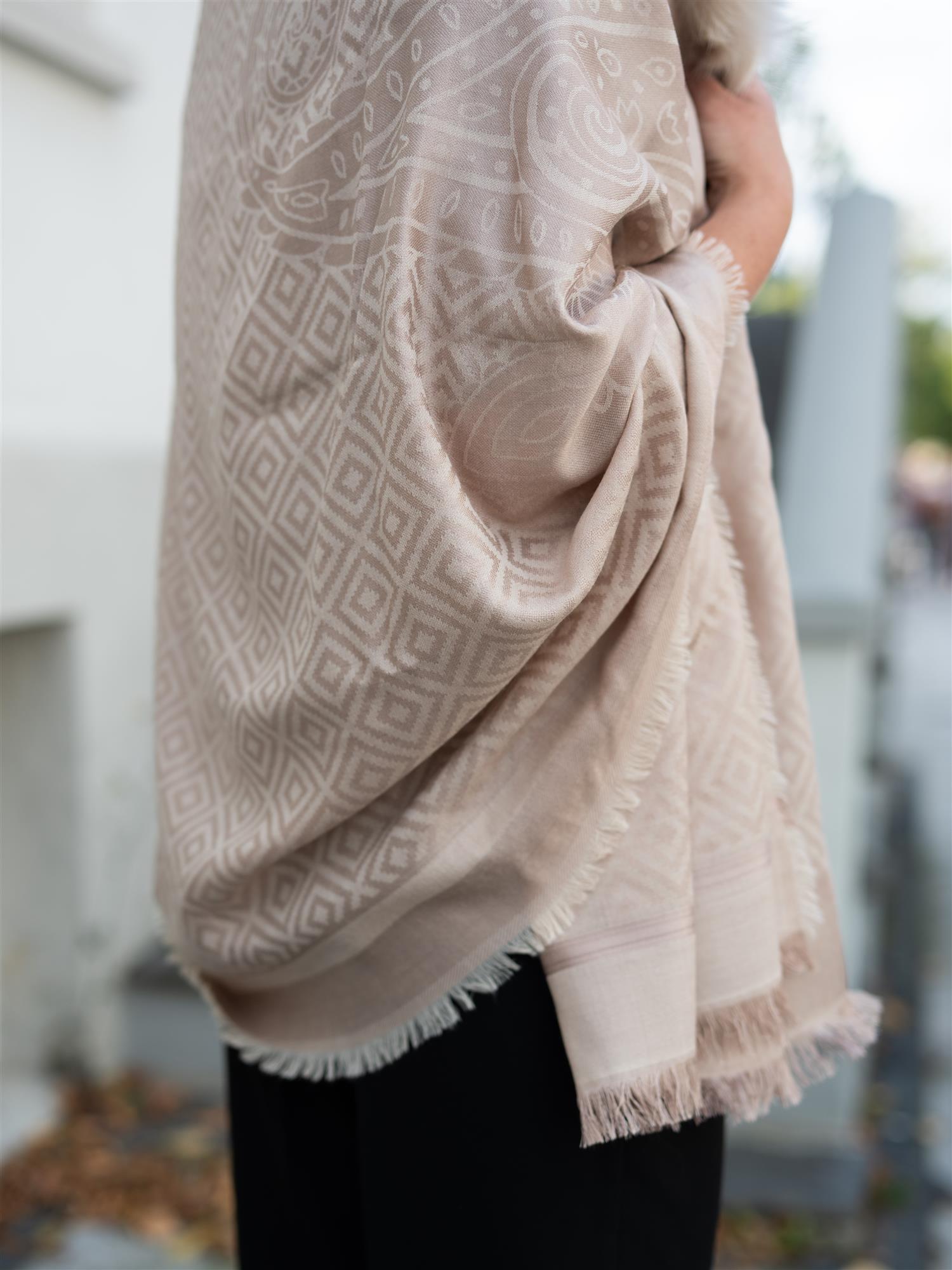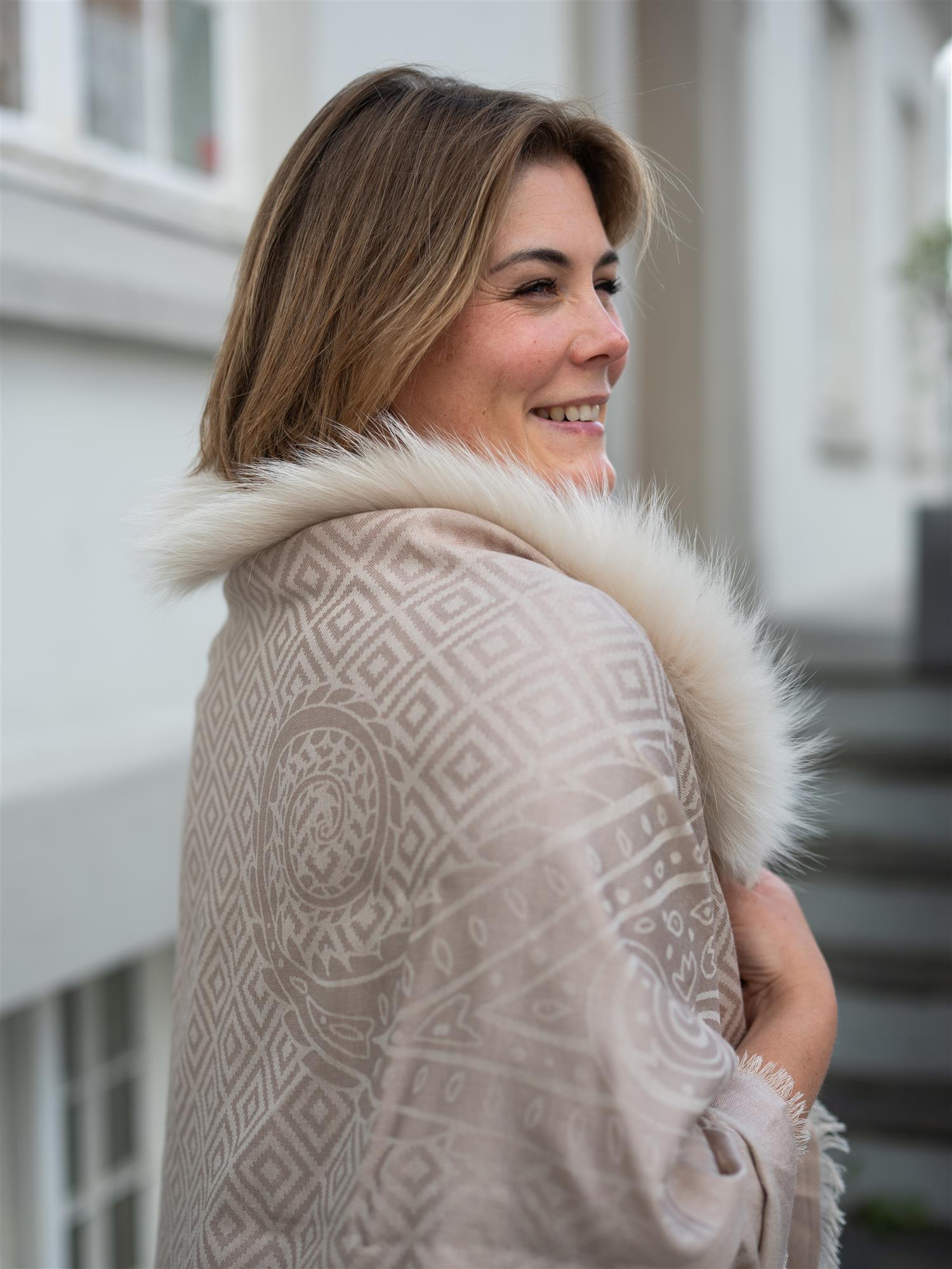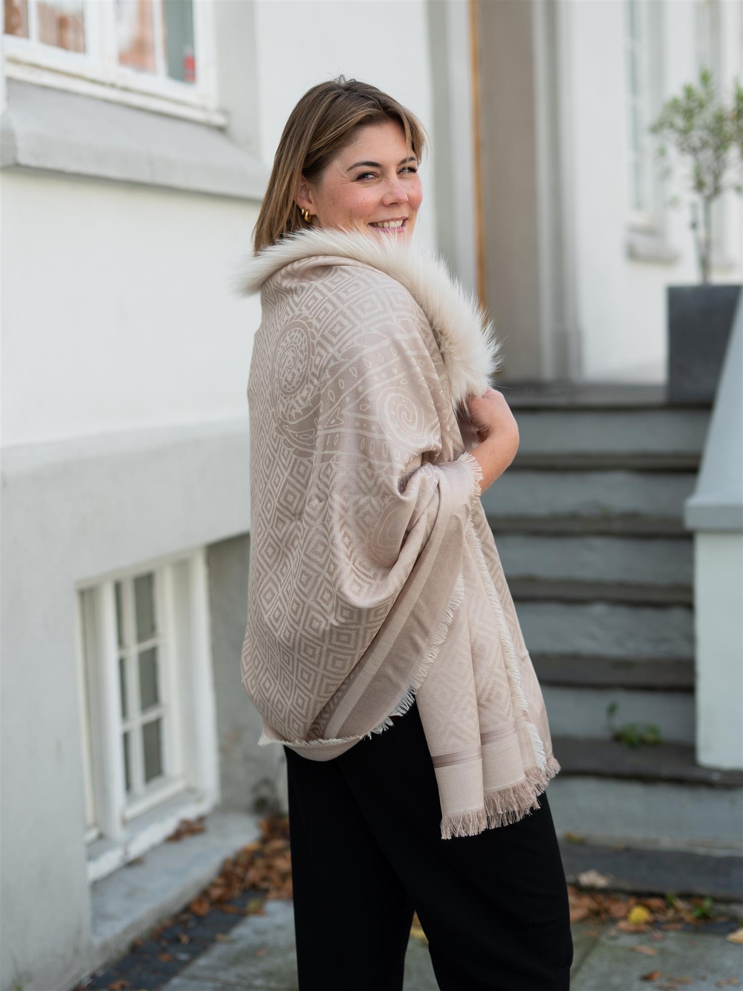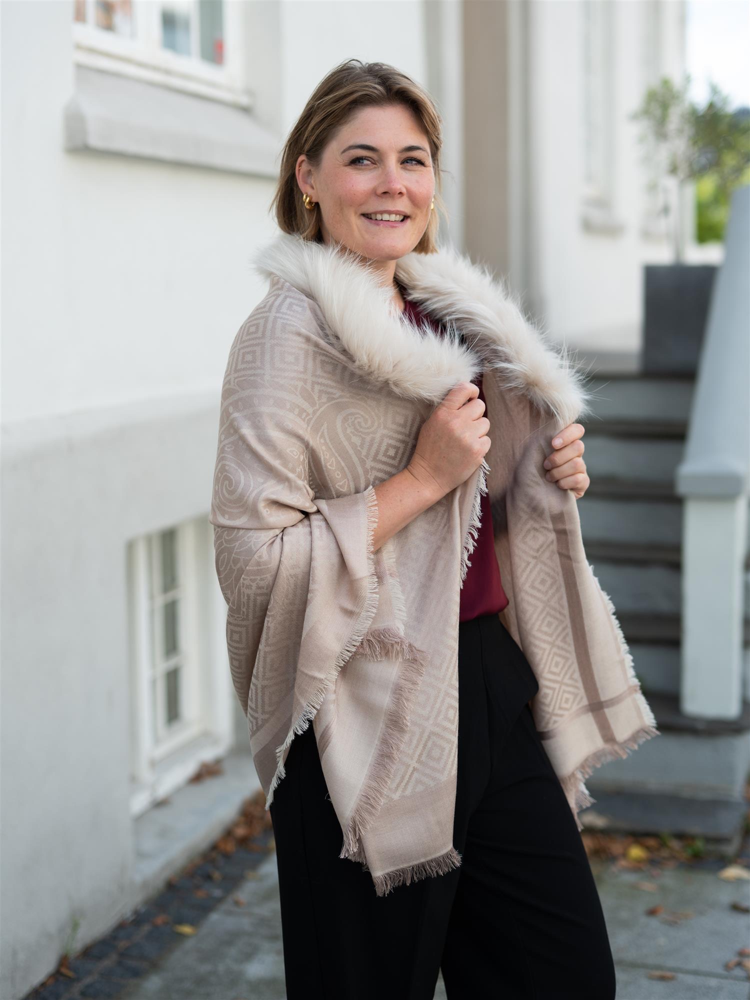 Delikat skjerf fra Mala Alisha i en lekker dus rosa farge. Skjerfet er diskret mønstret og har en deilig og eksklusiv pelskrage.