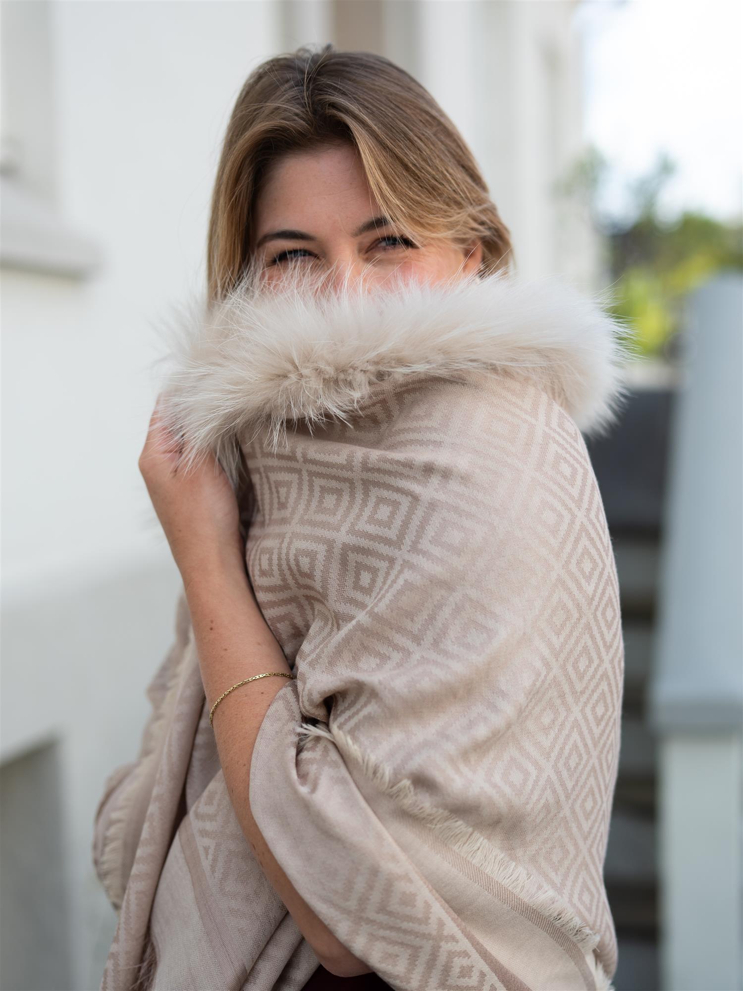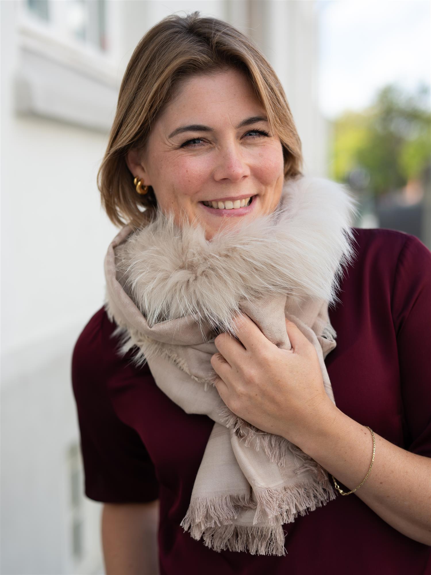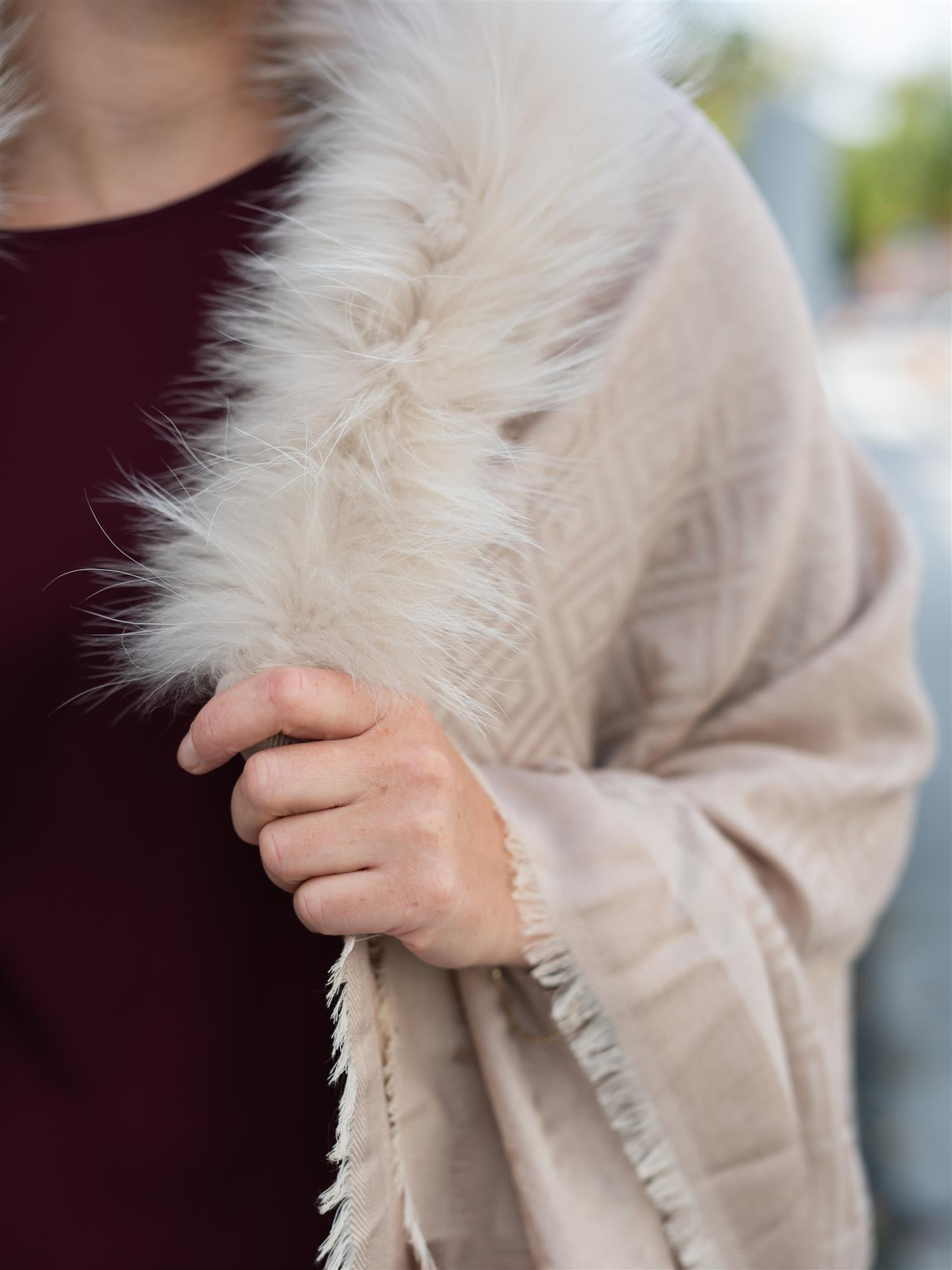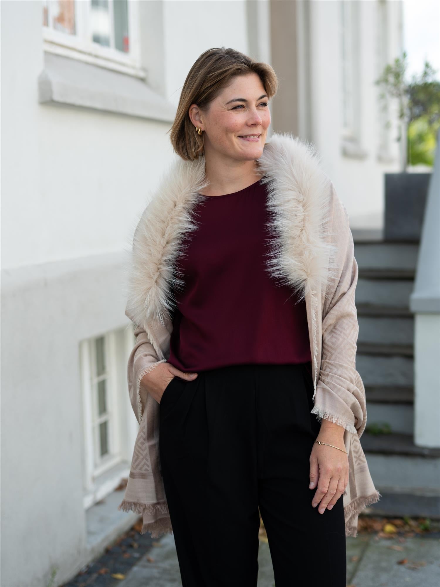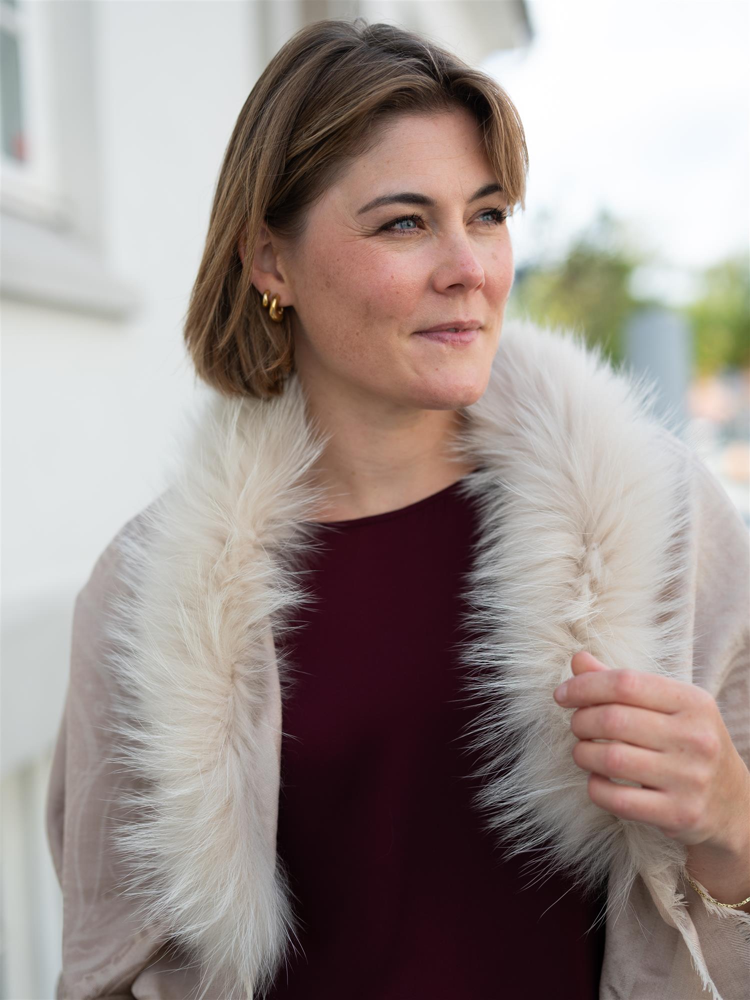 Delikat skjerf fra Mala Alisha i en lekker dus rosa farge. Skjerfet er diskret mønstret og har en deilig og eksklusiv pelskrage.